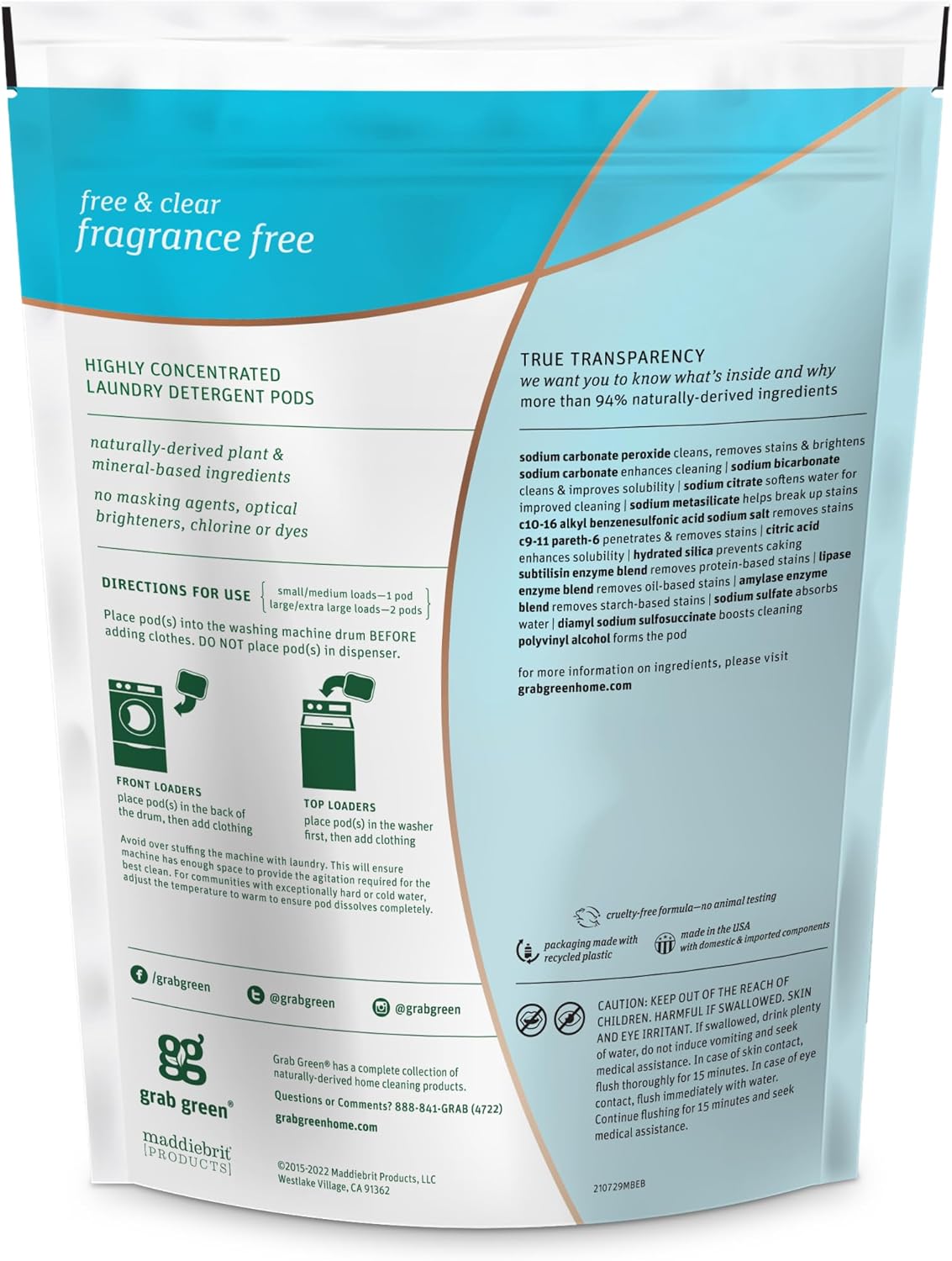 - Contains: 1- 24 Pod Bag of Grab Green Natural Fragrance Free 3in1 Laundry Detergent Pods. Our velcro closure bags are convenient and easy to use, no hassling with frustrating zip closures