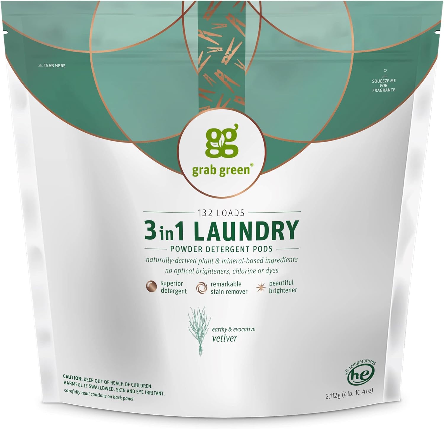 - Contains: 1- 132 Pod Bag of Grab Green Natural Vetiver 3in1 Laundry Detergent Pods. Our velcro closure bags are convenient and easy to use, no hassling with frustrating zip closures
