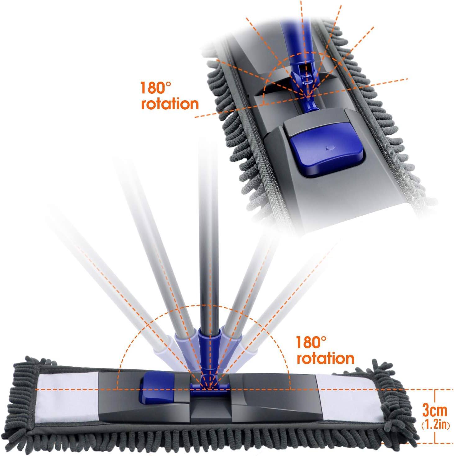 - 【Wet & Dry Floor Mop】:The dust mop comes with two type of materials which used in different scenarios. Chenille is suitable for dry mopping, and microfiber is suitable for wet mopping.Chenille mop pad has strong decontamination and water absorption ability.Microfibre head can grab dirt easily and won't drop everywhere.
