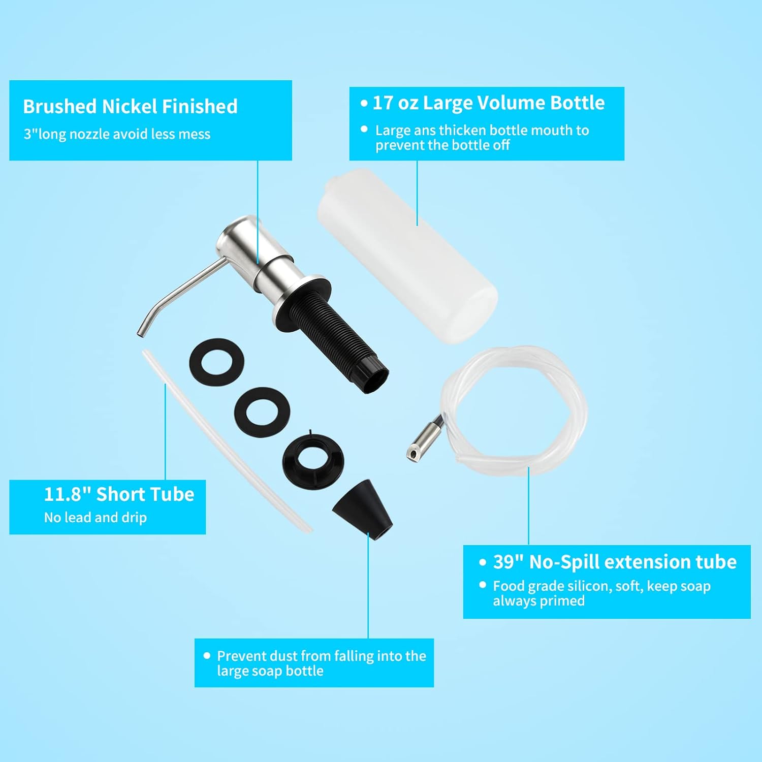 - ๐งใ PREMIUM QUALITY ใ Our built in sink soap dispensers are made with 304 stainless steel pump head with durable PVC soap bottle. The 1m silicone extension tube in food grade quality is soft and elastic, brushed Nickel surface makes it resistant to corrosion and rust. Countertop soap dispenser nozzle (can swivel 360ยฐ)avoid the soap splash,the pump always stay primed.