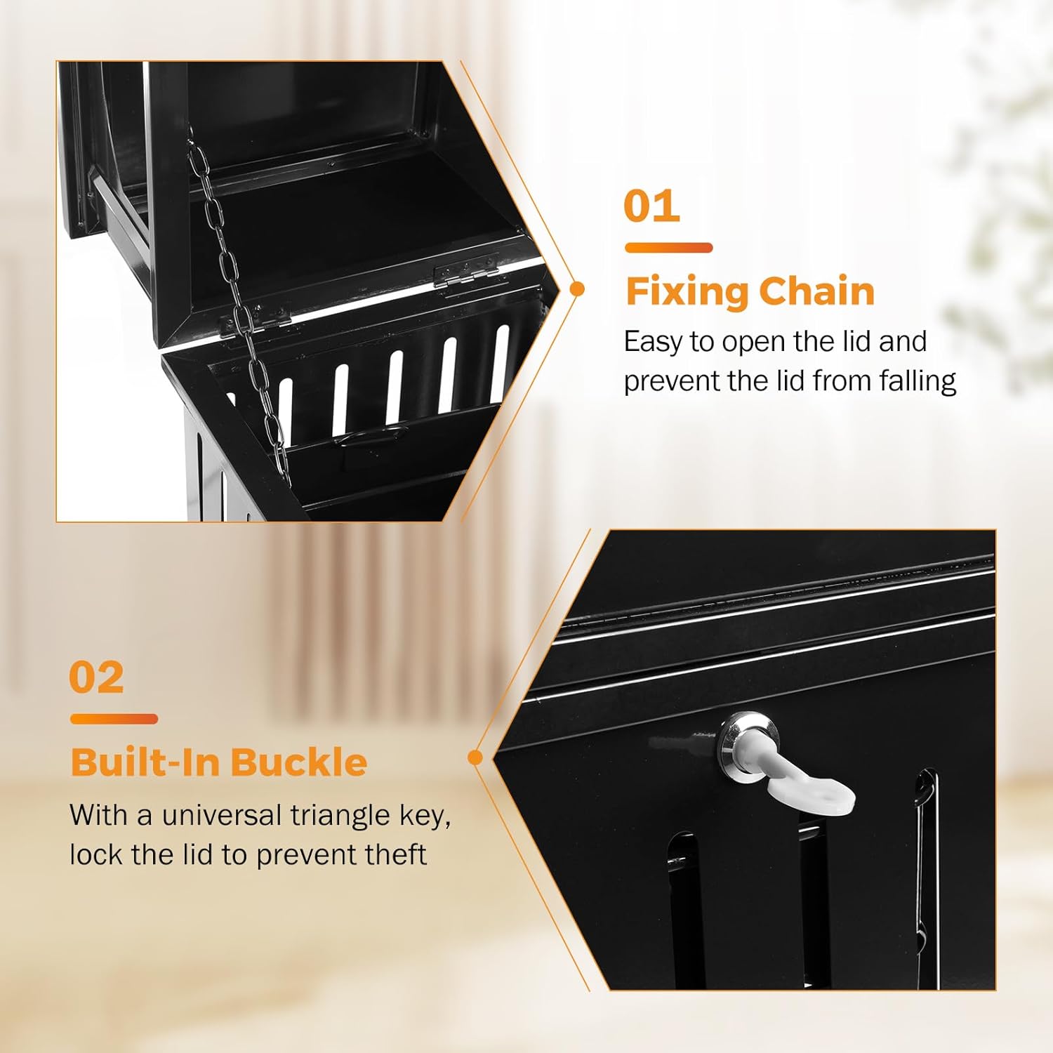 - HAND TOUCH-FREE DISPOSAL - Two-sided opening design allows you to discard waste without touching the lid. Includes a chip and peel-resistant rigid liner for easy maintenance. The lid is lockable with triangle keys.