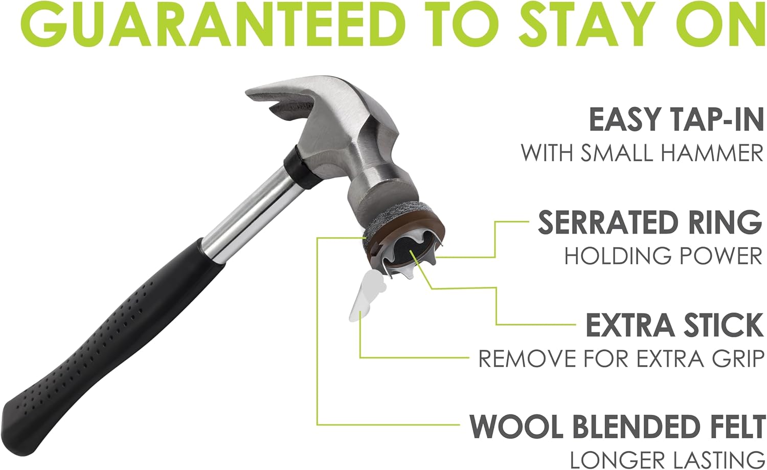 - Guarenteed to stay on furniture legs – Each tap in felt furniture glide features 5 steel prongs paired with a strong self-stick adhesive backing that hangs on and won’t come off chair feet / furniture legs (not for use on metal furniture legs). Premium felt furniture pads designed to stay on chair legs and last longer than other felt pads.