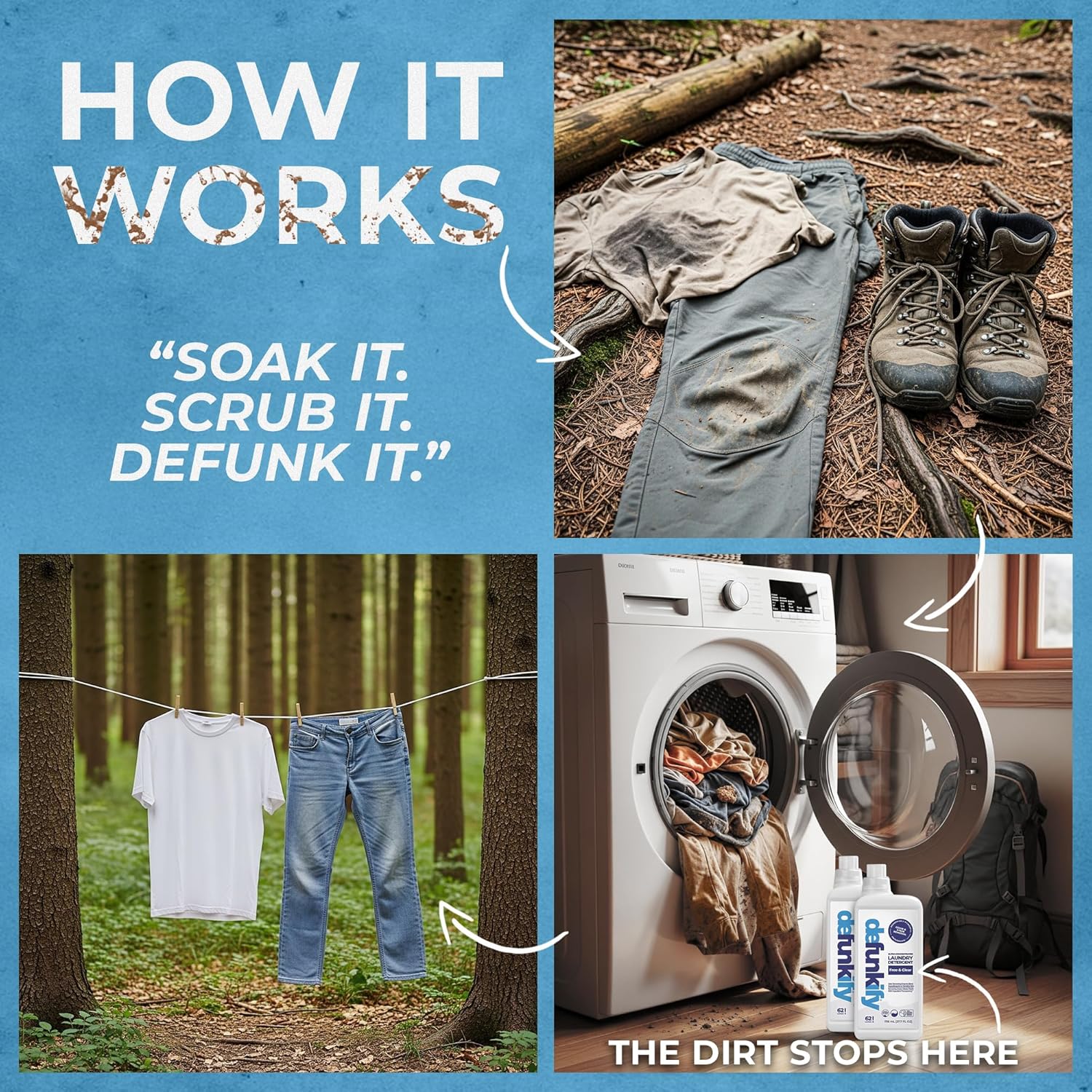 - 𝗪𝗮𝘀𝗵 𝘁𝗵𝗲 𝗙𝘂𝗻𝗸 𝗢𝘂𝘁!' 𝗚𝘂𝗮𝗿𝗮𝗻𝘁𝗲𝗲: Defunkify's laundy detergent enzymes clean deep within fabric fibers to eliminate the residue, oils, sweat & heavy cover-up scents left behind by other washing detergents. As a scent free 'Free & Clear' laundry detergent w/ all natural old odor eliminator & set-in stain remover ingredients, 𝘆𝗼𝘂𝗿 𝗰𝗹𝗼𝘁𝗵𝗶𝗻𝗴 𝘄𝗶𝗹𝗹 𝗯𝗲 𝗹𝗼𝗼𝗸𝗶𝗻𝗴 & 𝗳𝗲𝗲𝗹𝗶𝗻𝗴 𝗹𝗶𝗸𝗲 𝗻𝗲𝘄 𝗶𝗻 𝗮 𝘀𝗶𝗻𝗴𝗹𝗲 𝘄𝗮𝘀𝗵, 𝗴𝘂𝗮𝗿𝗮𝗻𝘁𝗲𝗲𝗱.