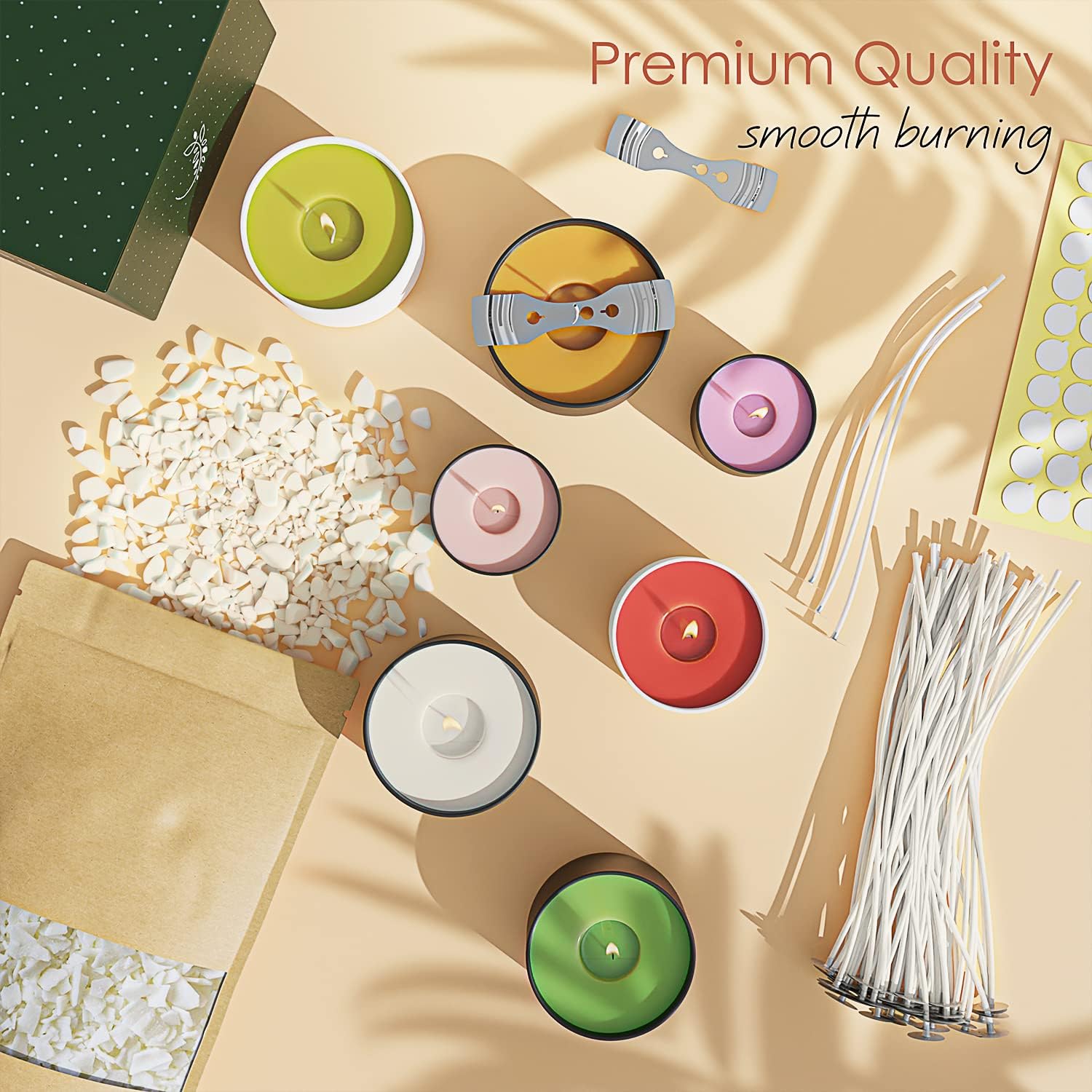 - SOY CANDLE MAKING KIT FOR ADULTS: Make your own candles with our candle making supplies kit: natural soy wax for candle making 8 lb bag, 100 cotton candle wicks for candle making, 100 candle wick stickers, 2 wick holders.