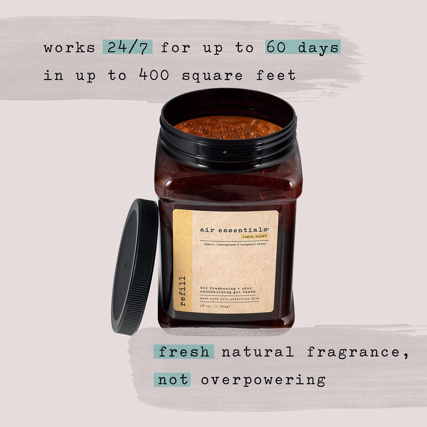 - MADE WITH PURE ESSENTIAL OILS - Air Essentials Air Freshening & Odor Neutralizing Gel Bead Refill contains only plant derived ingredients and a blend of pure essential oils. Each jar provides a pleasant fragrance that does not overwhelm the senses. The Gel Beads will work 24/7 for up to 60 days in up to 400 square feet.