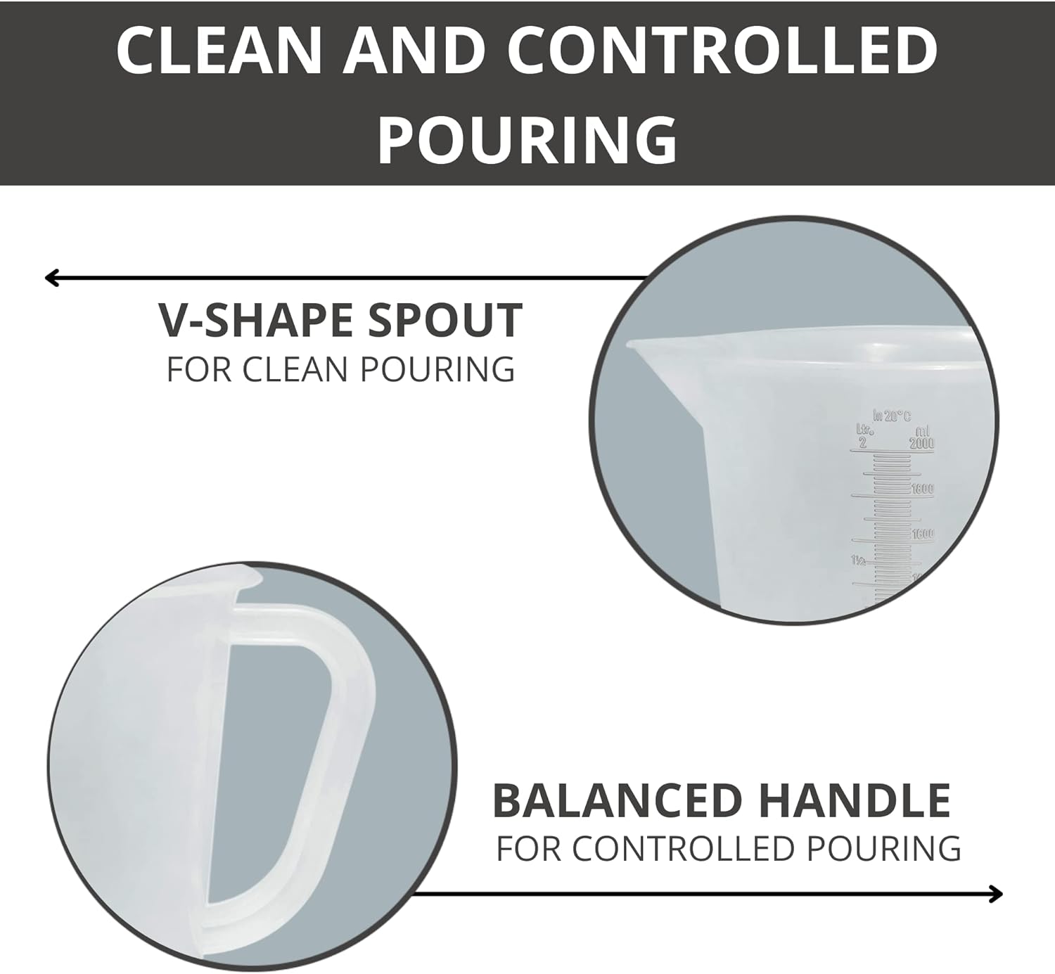 - Easy Pouring Container for Liquid - This 2-quart measuring cup, also suitable for plastic measuring cups for liquids, offers exceptional optical clarity with easy-to-read raised graduations. It includes a spout for convenient pouring and a handle for secure handling and lifting, making it a versatile choice.