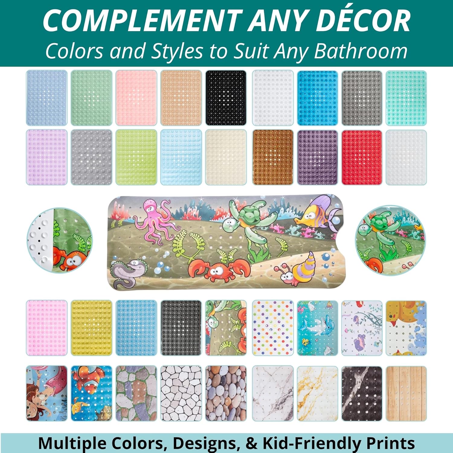 - EXTRA-LARGE SIZE Measuring an extended 40 x 16 inches, our long, kid-friendly bath mat guarantees maximum coverage. Many other mats are thinner and smaller, leaving areas of your tub exposed. Our secure suction cup durable mat is a versatile and essential accessory for any family bathroom.