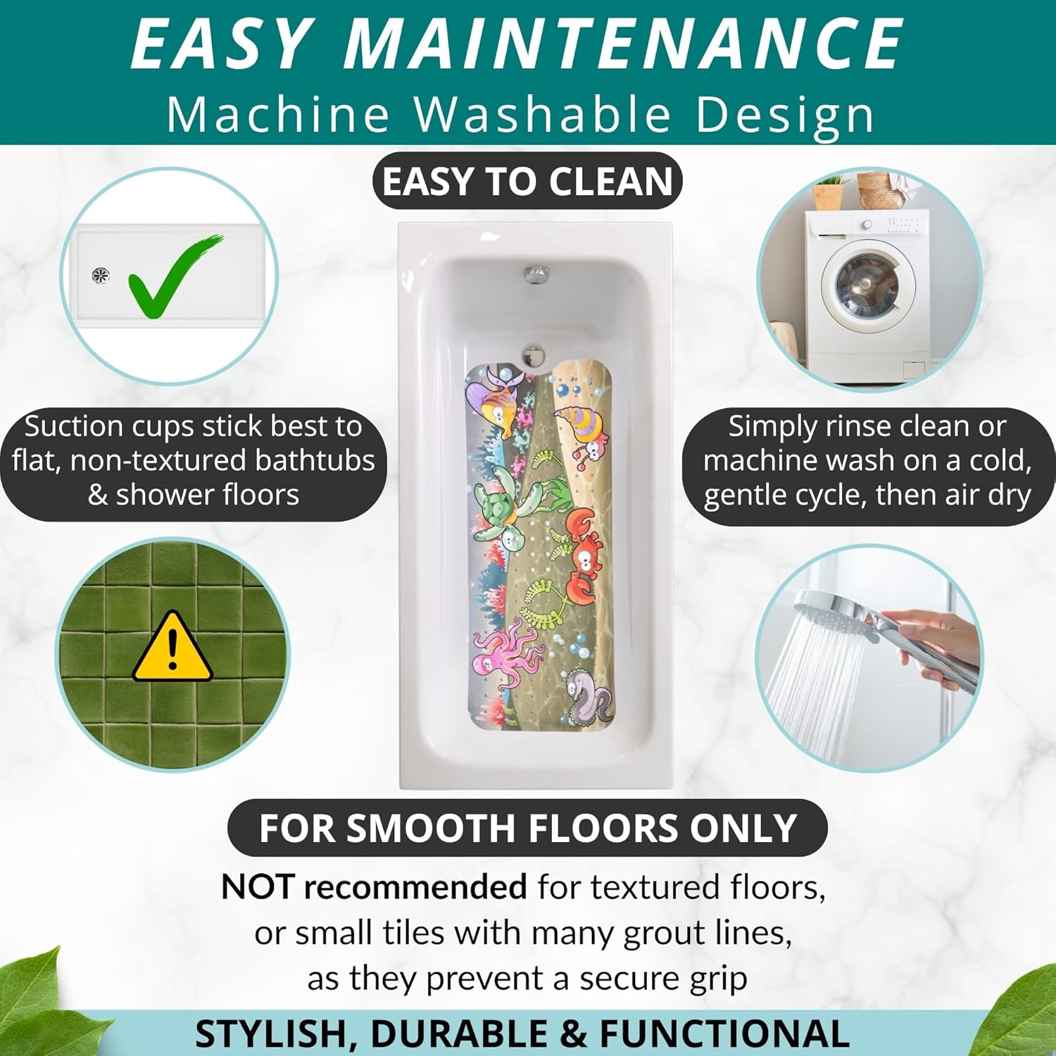 - EASY TO CLEAN Crafted from durable, easy-to-clean, and safe materials, this bath mat simplifies maintenance. Rinse it in the shower or tub, or toss it in the washing machine on the cold wash cycle and air dry for a quick and convenient clean.