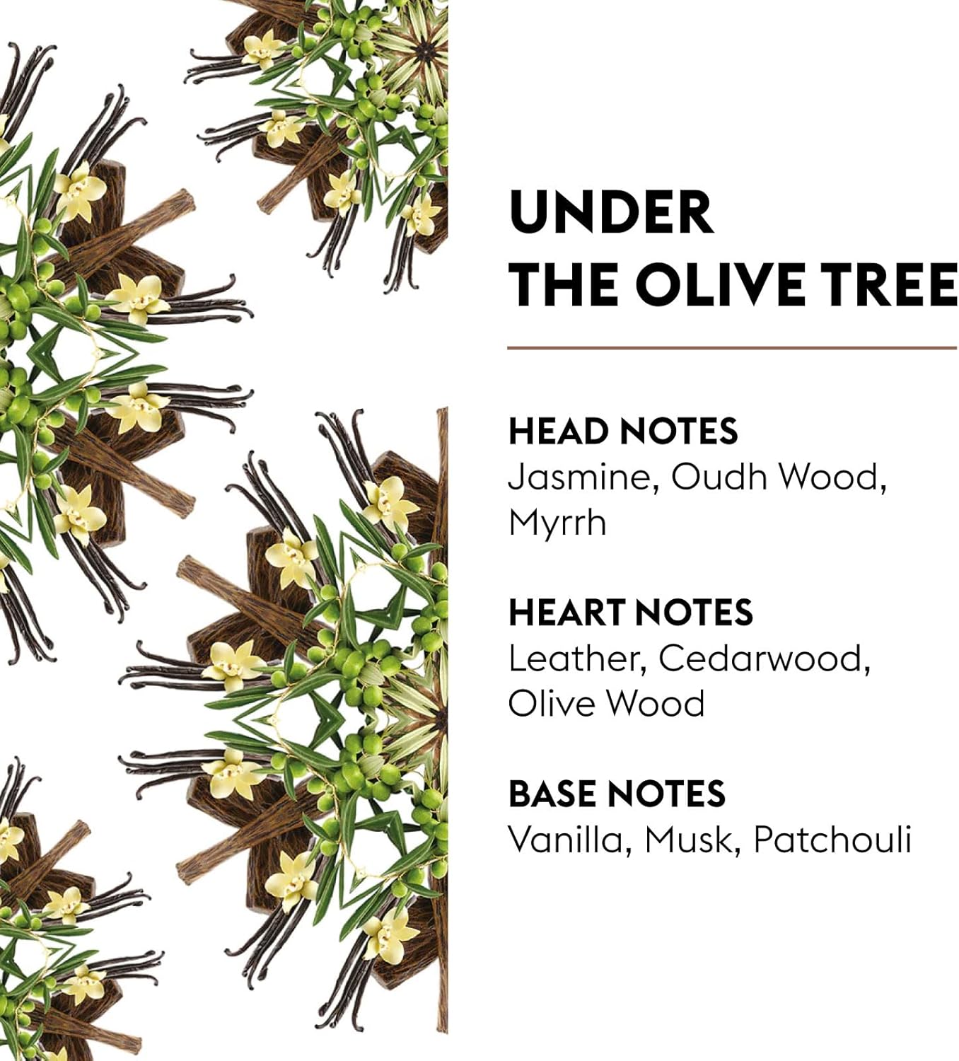- FRAGRANCE: Jasmine - Oudh Wood - Myrrh -Leather - Cedarwood - Olive Wood - Vanilla - Musk - Patchouli
