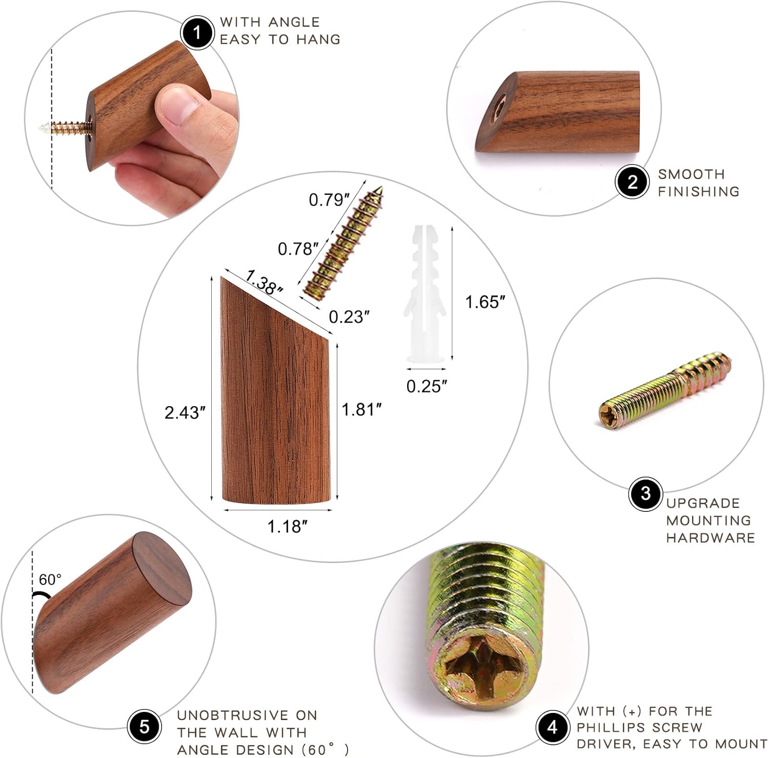 - UPGRADE INSTALLATION – We have UPGRADED the screw with a notch (+) for the Phillips screwdriver. So it is easier to install. 1) Drill a hole with a 5/16 bit for drywall (3/16 for stud). 2) Hammer the anchor in until it is flush with the wall. 3) Screw the metal-screw into the wall anchor with a driver. 4) Twist the wood-hook into the wall-mounted screw and tighten it to the wall with a proper angle (mounting hardware included)