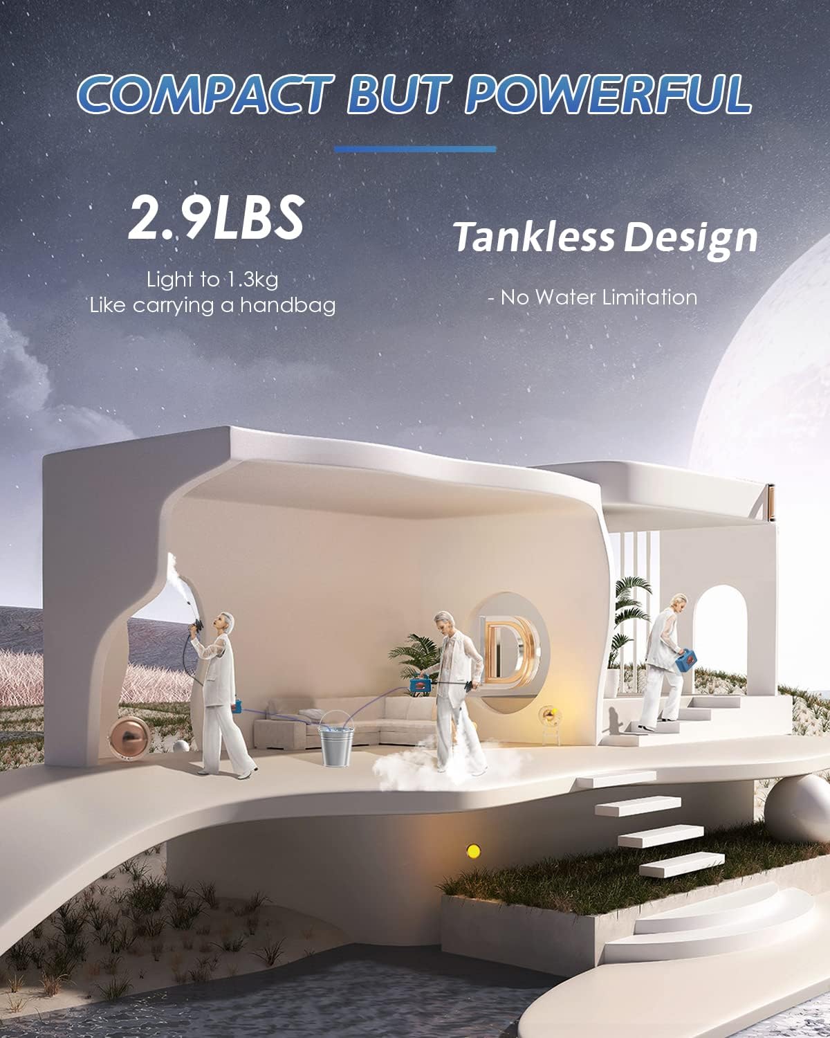 - [TANKLESS DESIGN] This compact steam cleaner for home use has a built-in 3.3-foot water inlet hose, which can insert into the external bucket as a water source. Have fun with the continuous and steady natural steam. No need to hold heavy and bulky tank on hand!