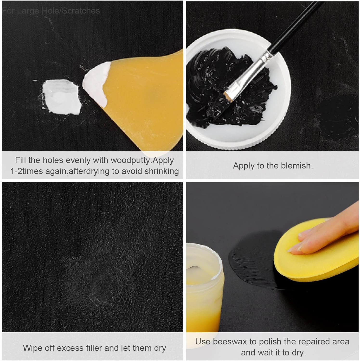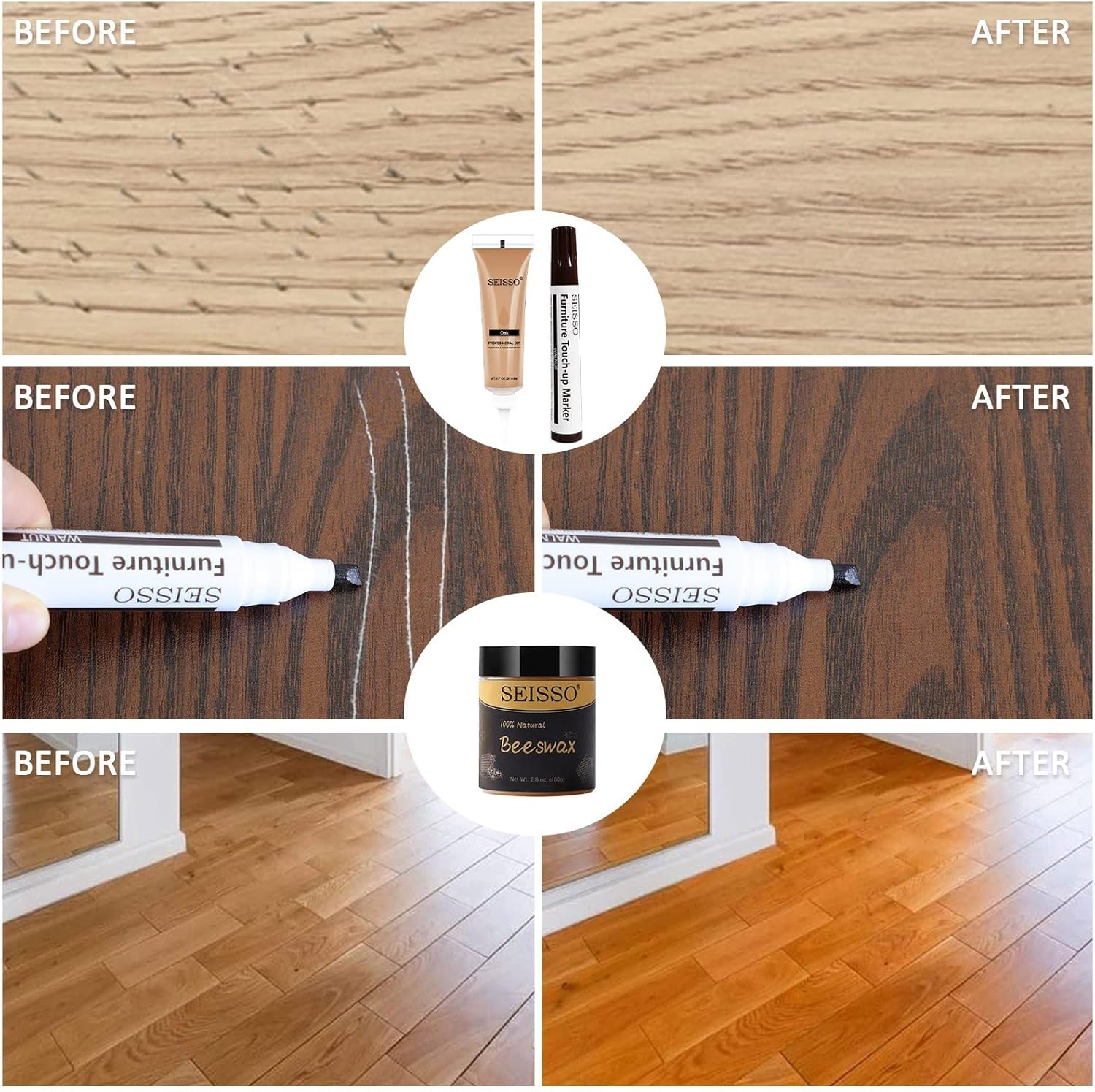 - Versatile Repair: SEISSO wood filler and polish kit is ideal for covering up scratches and restoring the beauty of your wooden furniture. It effectively repairs cracks, holes, and discoloration on surfaces such as doors, floors, tables, cabinets, and more.