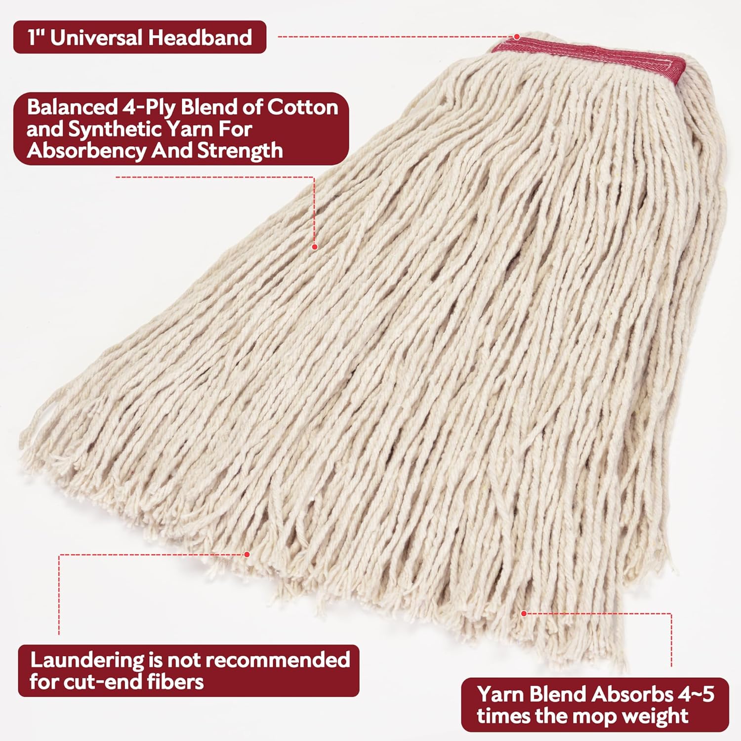 - Exceptional Absorption - Cotton-synthetic blended yarn mop with excellent absorbency picks up liquids and spills effectively.It also provides a soft and gentle touch,being suitable for various floor surfaces.4-ply cotton cut-end mops reduce fraying and preserve hygiene&Freshness of floors