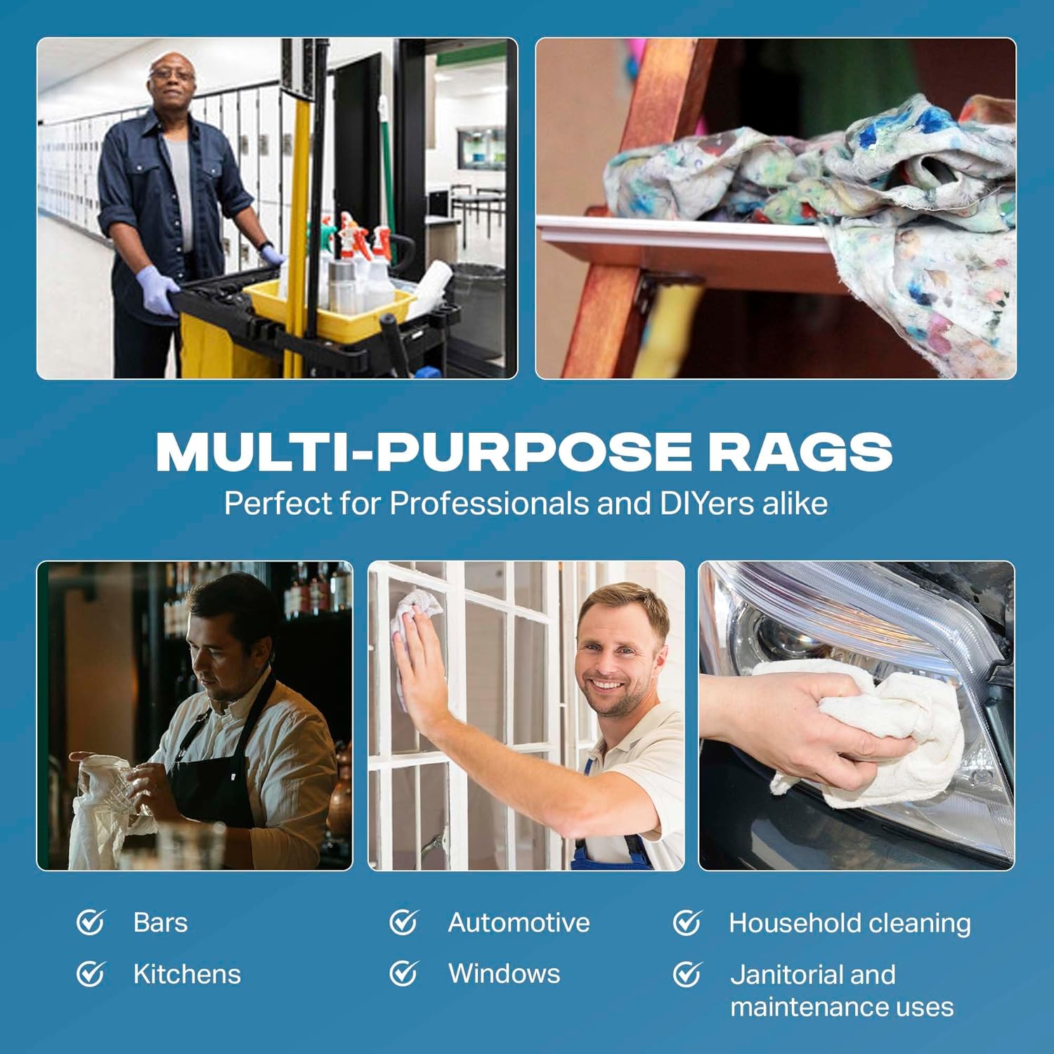 - Ideal for Pros & DIYers Alike: Trusted by mechanics, technicians, and cleaning professionals, these shop rags deliver consistent, lint-free performance. Use these shop towels for wiping tools, cleaning machinery, detailing vehicles, or general maintenance where high-quality cotton shop towels and rags are essential.