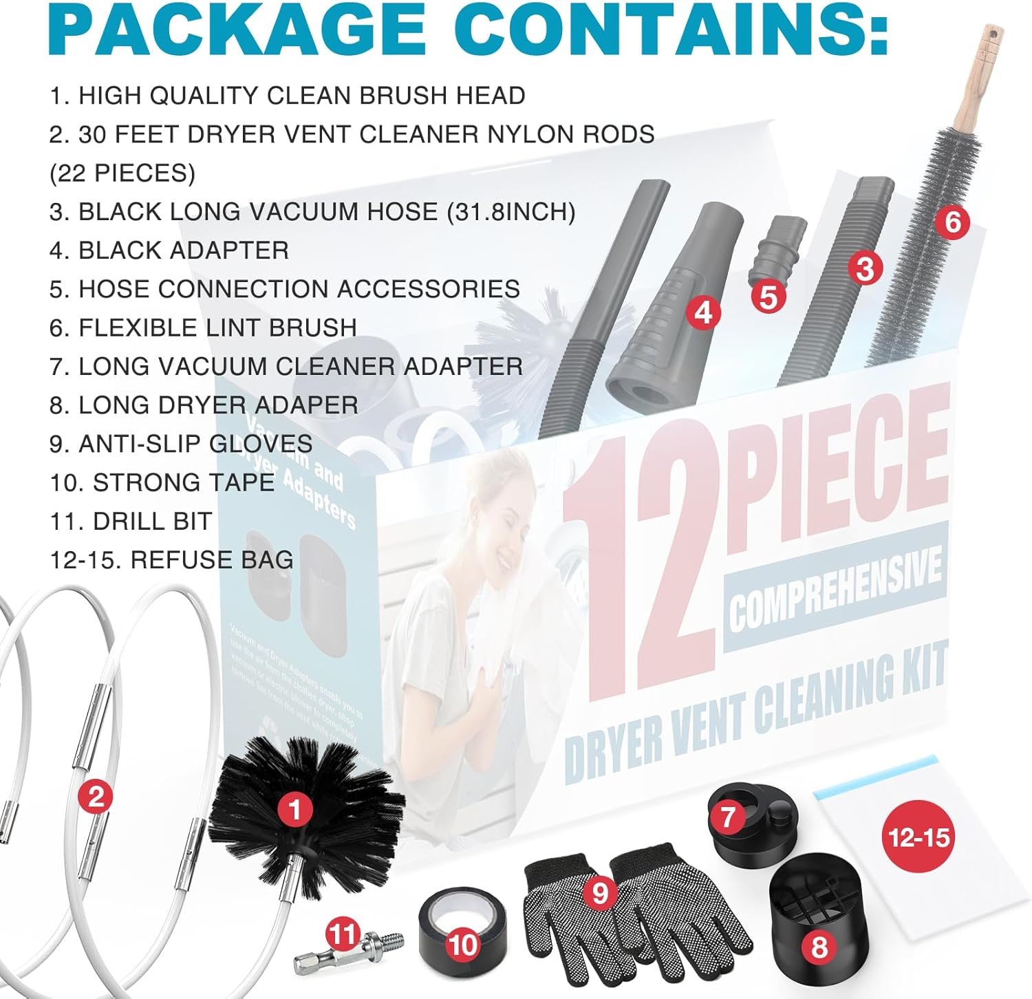 - [Efficient dryer cleaning kit]-Professional dryer vent cleaning tool set can help you deep clean buildup lint in the dryer. Including 30feet vent cleaner set × 1, Dryer Lint Vacuum Attachment × 1, Long Lint Trap Brush × 1, Vacuum Cleaner Adapter x1, Dryer Adapter x1, Drill Bit x 1, Strong Tape(for nylon rod) x1, Anti-slip Gloves x1, Refuse Bag x1
