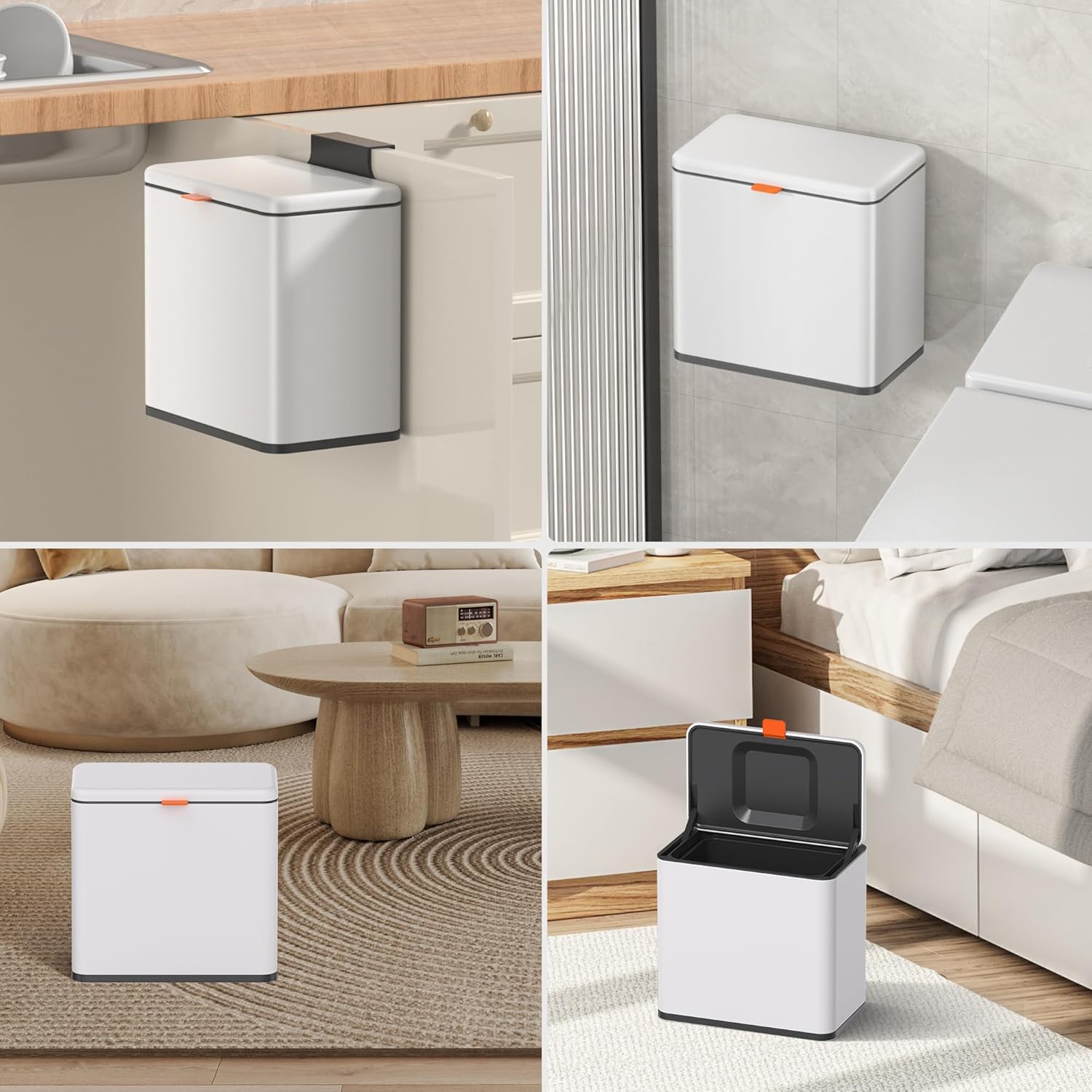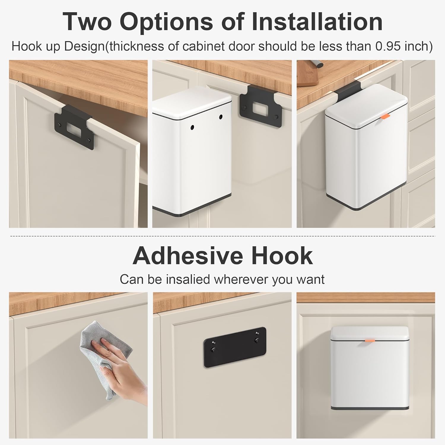 - 【WALL MOUNTED/COUNTERTOP/ UNDER SINK TRASH CAN】: No need to bend over. The trash can provide Two opening and installation methods,Effortless and Fits for Most Cabinet Doors, Pantry Doors. The thickness of door should be less than 0.98" (2.5cm). Small trash can can also be glued on kitchen or bathroom wall or under the sink.