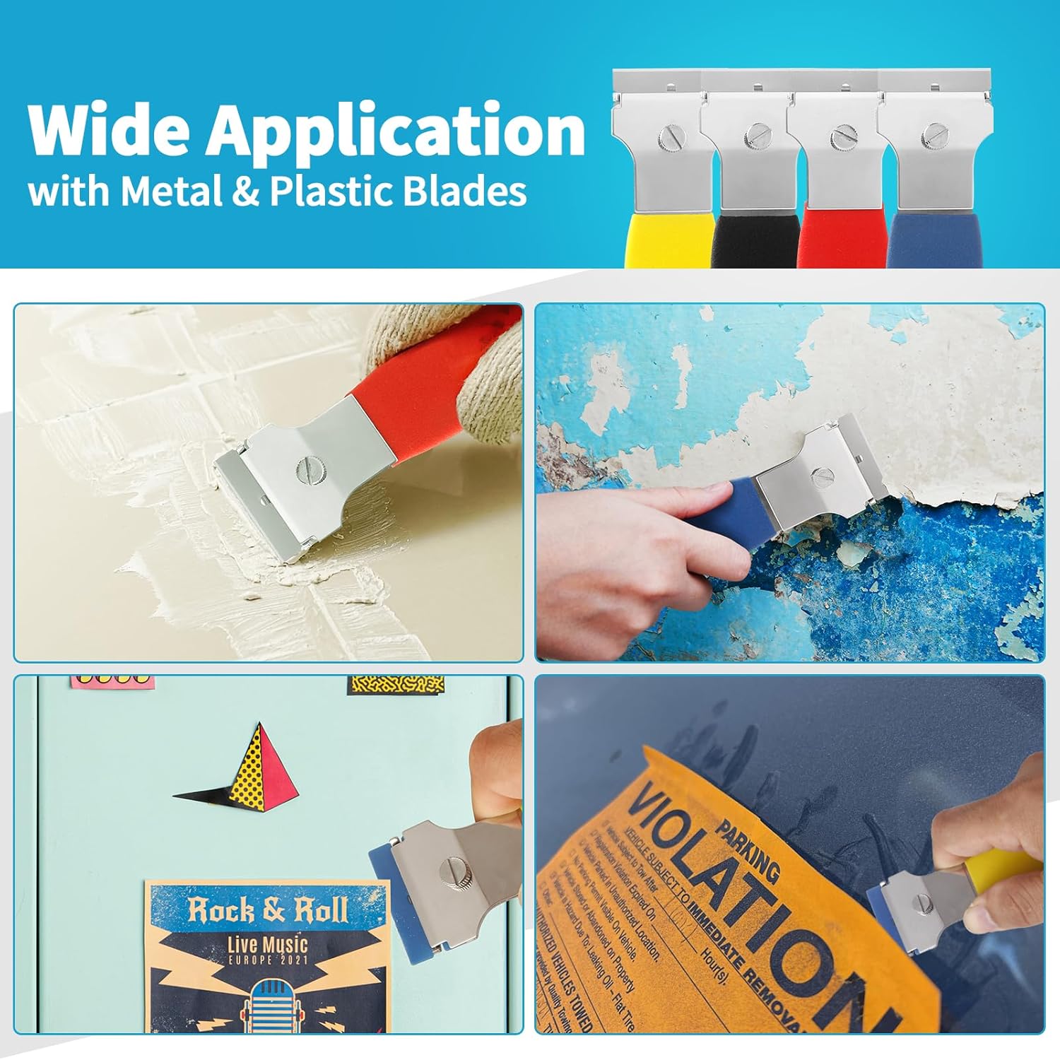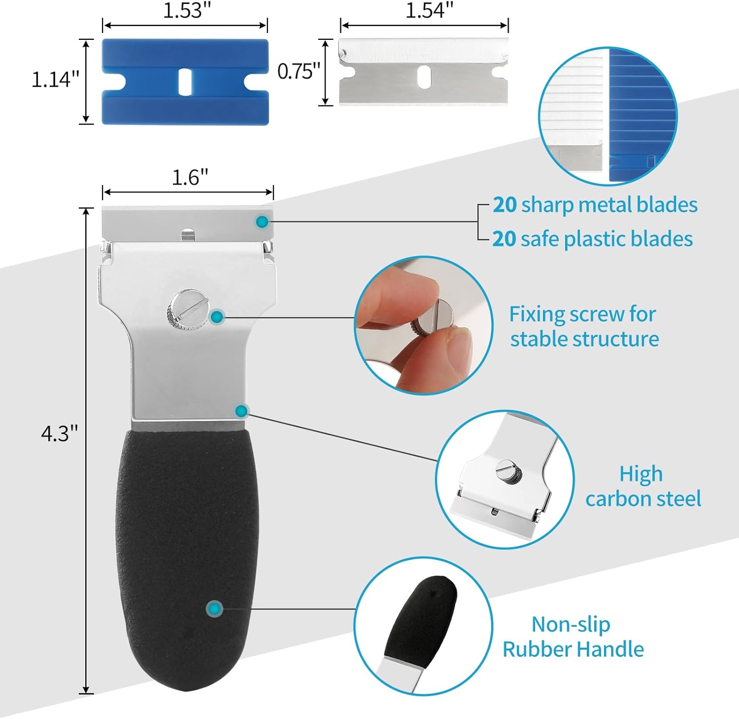 - COMPREHENSIVE KIT: The 4 pack scrapers come with extra 20 metal blades and 20 plastic blade. With a total of 40 blades at your disposal, you're equipped to effortlessly tackle a range of cleaning challenges while ensuring an enough supply of replacements.