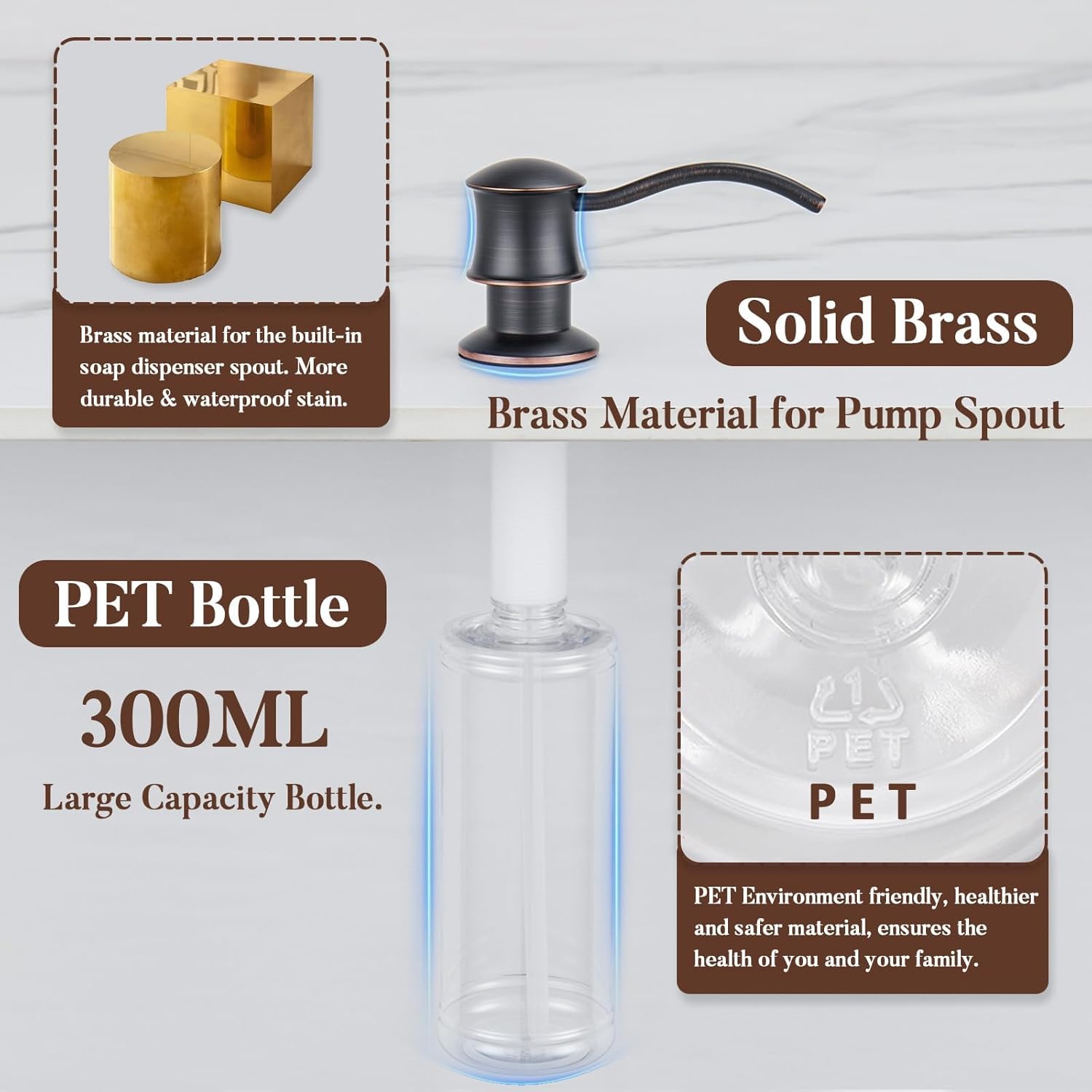 Built in Soap Dispenser for Kitchen Sink Countertop, Solid Brass Pump Head Long Spout with 10.2 Ounce PET Food Safe Material Lotion Bottle, Oil Rubber Bronze Finish