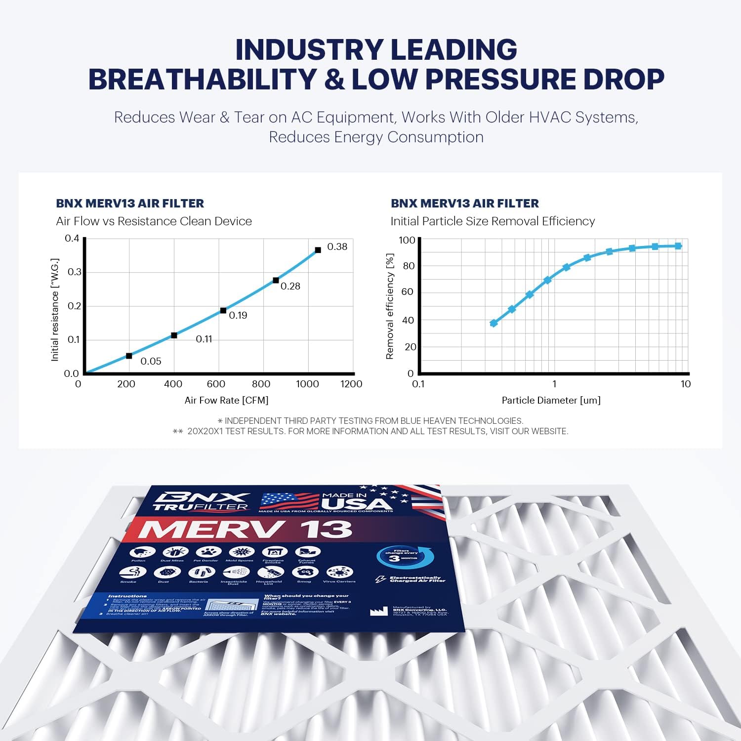 - SUPERIOR PERFORMANCE - The BNX MERV 13 air filter media outperforms standard fiberglass filters and adopts the latest in electrostatic filtration technology to capture maximum pollen, mold bacteria, smoke, carriers & other microscopic particles while maintaining industry leading superior low air flow resistance.