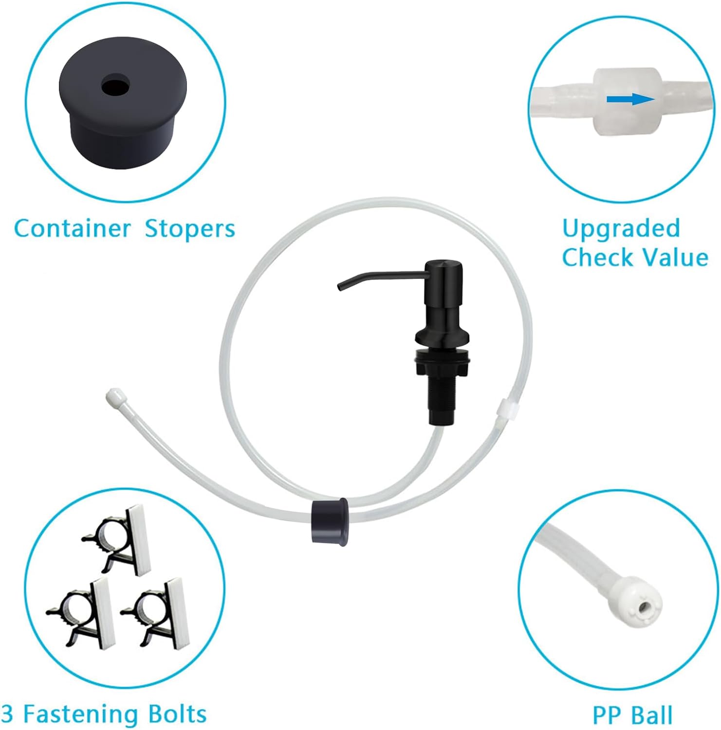 - Package includes: 1 sink soap dispenser pump, 3 bottle caps (fit most soap containers), 1 check valve connects two tubes, 1 pp ball, 1 lock nut and 2 washers, 3 Punch-free cable tie clips.