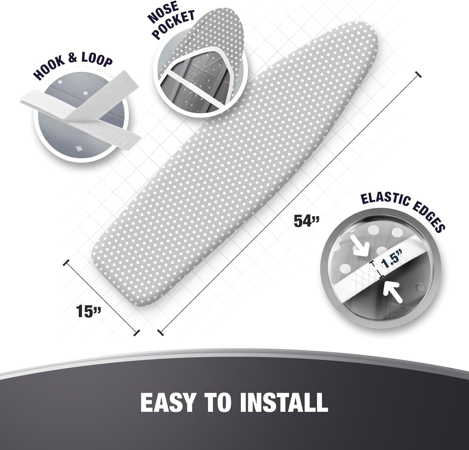 - EASILY FITS STANDARD 15x54 SIZE BOARDS: The ironing board cover can be installed very easily thanks to its durable elastic edges or adjustable drawstring tightening, strong fastener straps and sturdy nose pocket. It is designed for standart size boards in 15x54" dimensions.