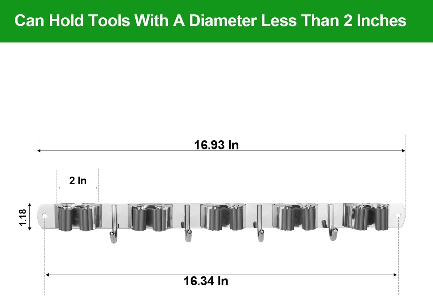 - [Sturdy & Non-slip] The broom and mop holder wall mount with 5 slots and 4 hooks is made of rust-proof 304 stainless steel, which is beautiful and much more durable than plastic materials, It's non-slip high elasticity clips can holds your broom, mop, umbrella or other garage tools firmly. You can install the tool storage rack with self-adhesive or screws to mount on the wall.