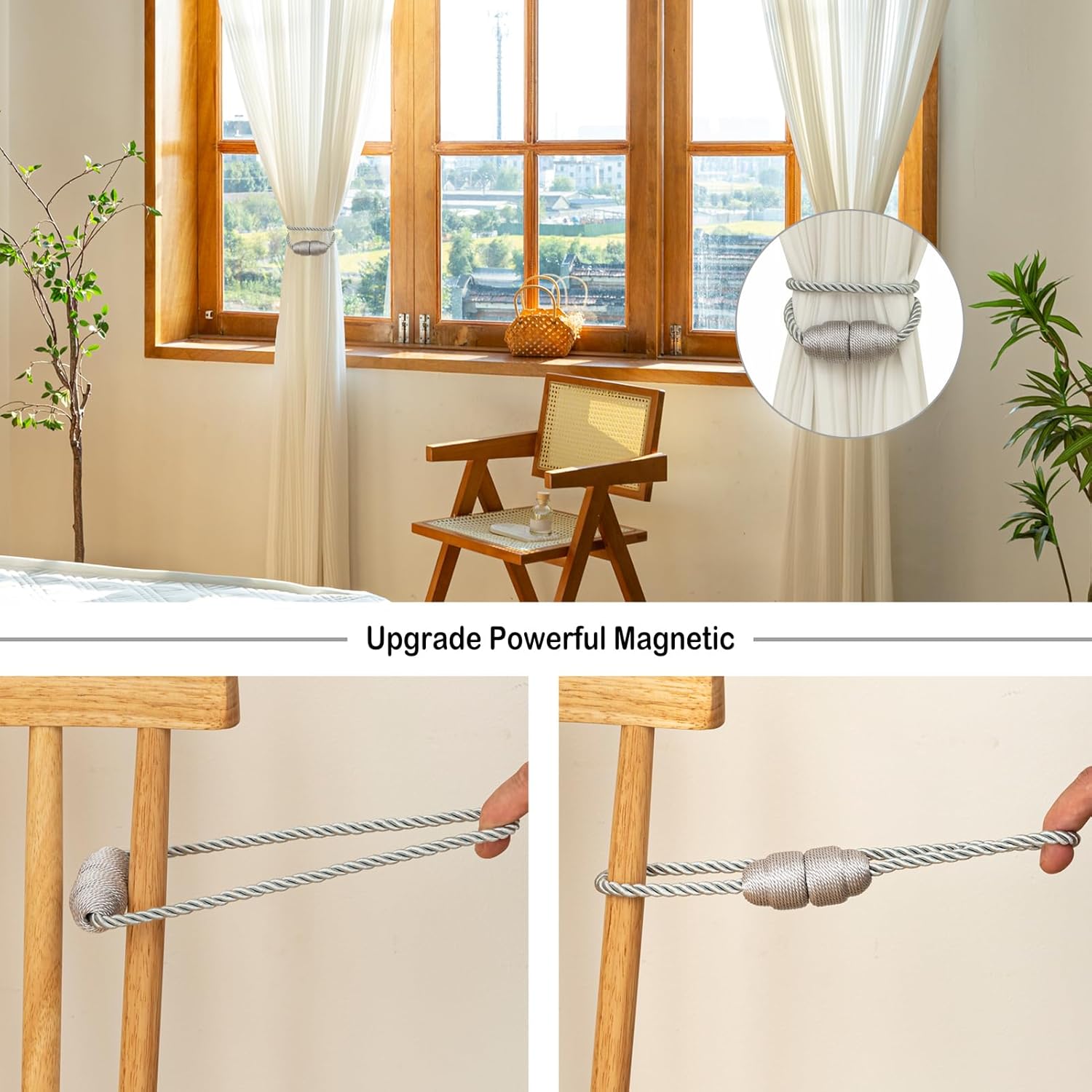 Magnetic Curtain Tiebacks Rope Curtain Tie Backs for Curtains 4 Pack Curtain Holders for Drapes Decorative Window Curtain Holdbacks, Grey