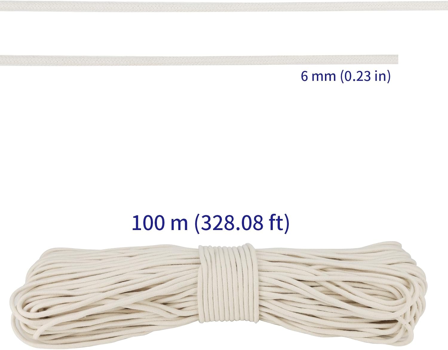 - SIZE - The total length of the white cotton rope is 328 feet, with a diameter of 1/4 inch. The ideal size can meet all your craft needs, and you can also cut any size. The length is sufficient to meet your daily needs.