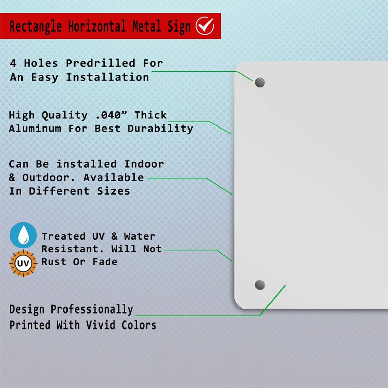 - ✔high Durability- High-Quality Materials, Inks, And Sheeting To Ensure Long-Lasting Durability And Sharp Lettering And Imaging On Custom Signs. 100% Rust-Free Aluminum Used For Long-Lasting Wear Indoors Or Outdoors.