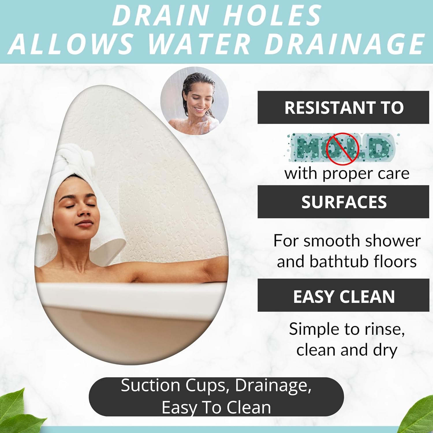 - DRAIN HOLES strategically placed drain holes promote efficient water drainage, preventing water accumulation. Easy to Clean Low-maintenance mat that is easy to clean and maintain. Simply rinse or wipe down for a clean bathing environment.