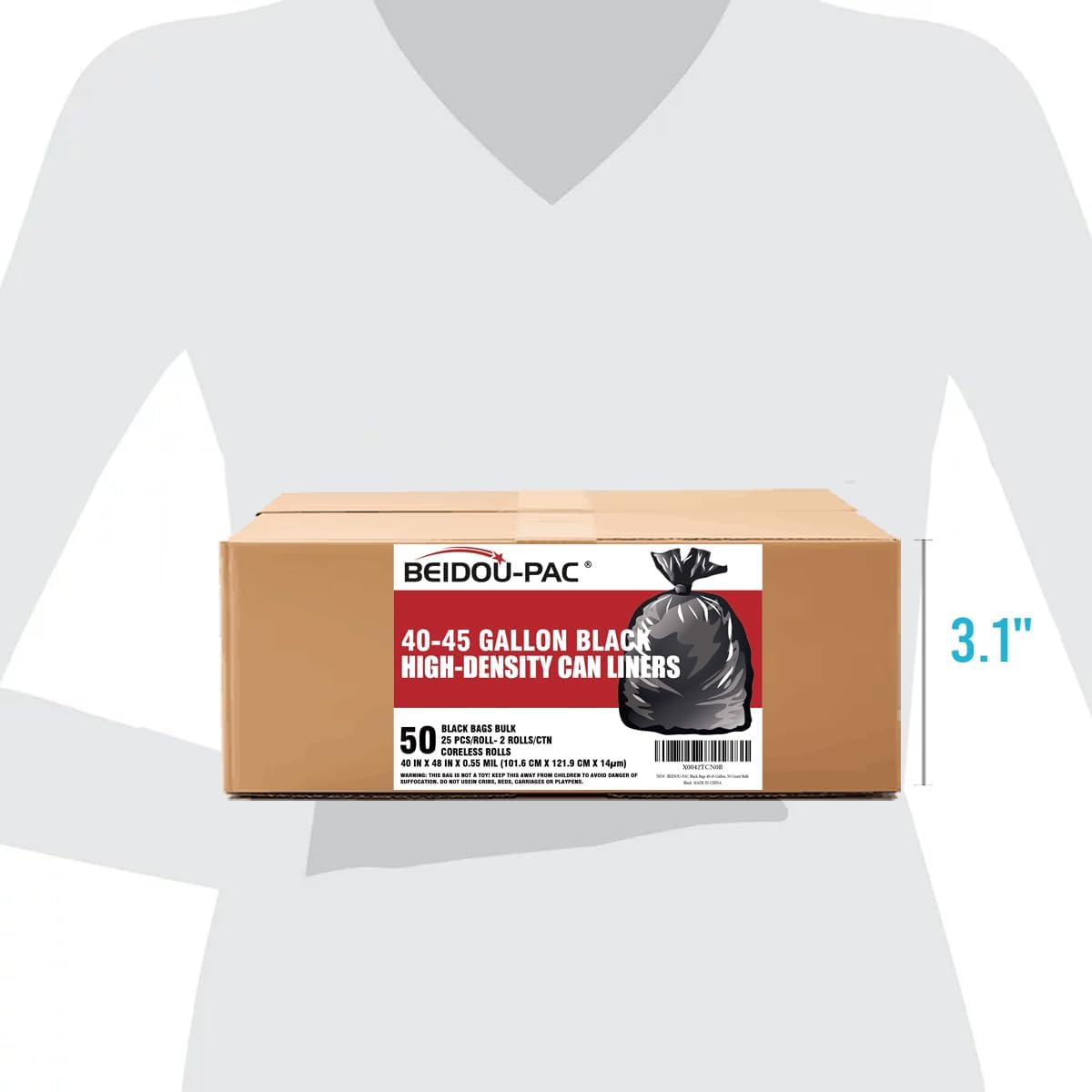 - 1, Product information: BEIDOU-PAC 40-45 gallon large balck plastic recycling trash bags, Size: 40" x 48"x 14 mic, Total 50 bags bulk (25 PCS/ROLL, 2 CORELESS ROLLS/CTN), Perfect for 40-45 Gal Capacity Office, commercial, industrial, or residential waste.