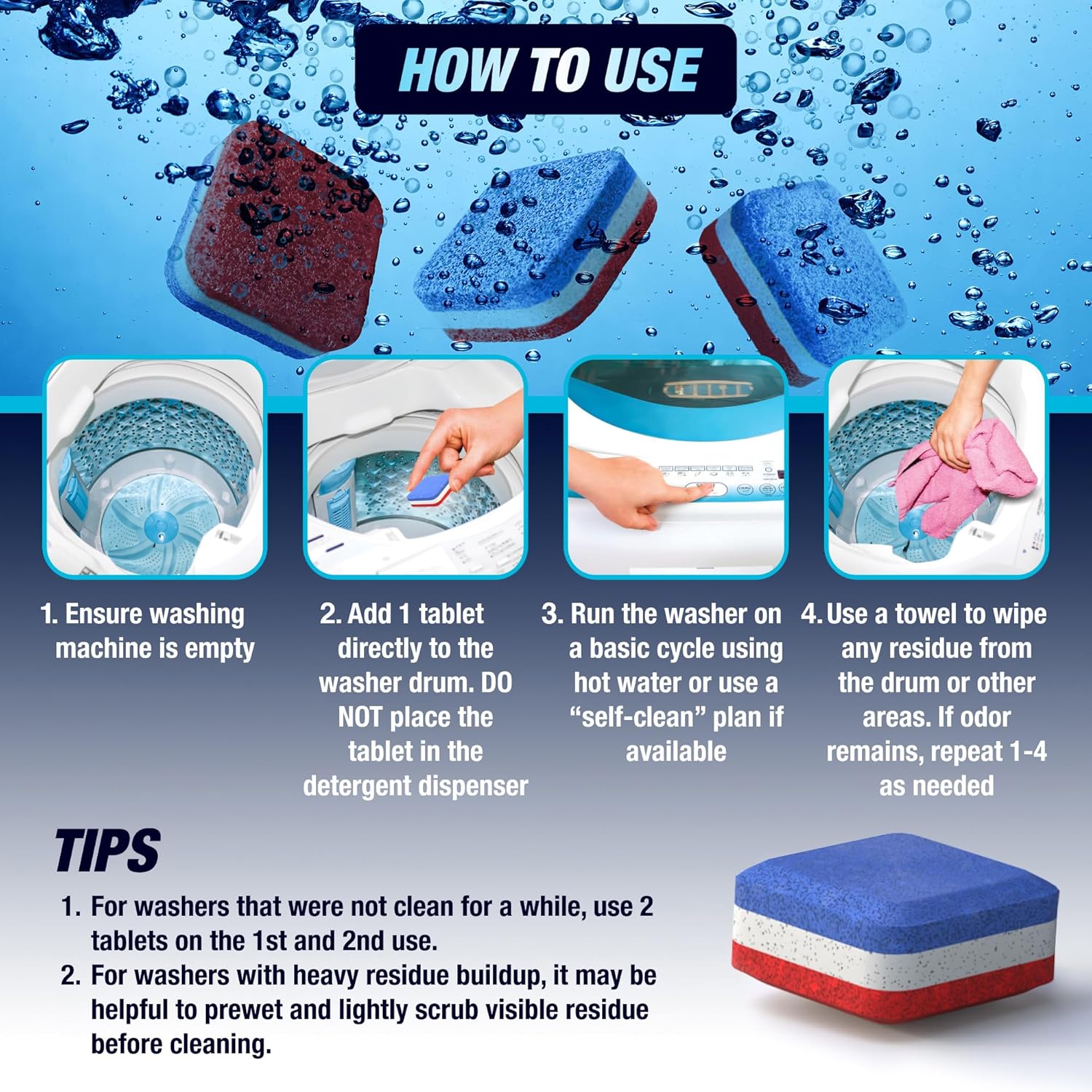 - Easy, Mess-Free Use: No measuring, no pouring, and no mess; Simply place one tablet directly into your washer drum, and let our powerful formula do the hard work; Enjoy a hassle-free cleaning experience with just one tablet per cycle, making washer maintenance easier than ever