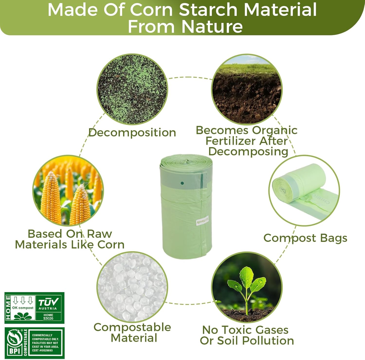 - Certified Reliability: Our compostable bags are BPI Certified, OK COMPOST Certified, and Seedling Certified from TUV, ensuring reliable composting performance.