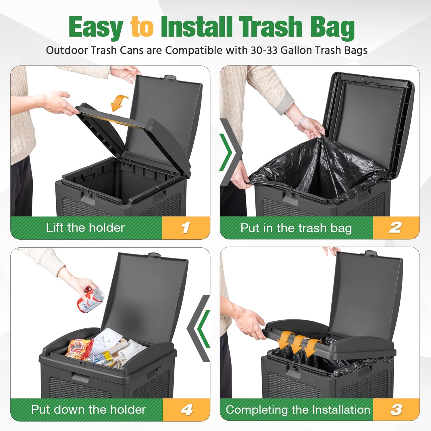 - Easy to Install Trash Bags: The waste bin for outdoors is compatible with 30-33 gallon trash bags. You need to lift the trash bag holder, put on the trash bag, put down the holder, and then finish the installation. After opening the inner lid, the garbage bag can be stably fixed in the card slot.