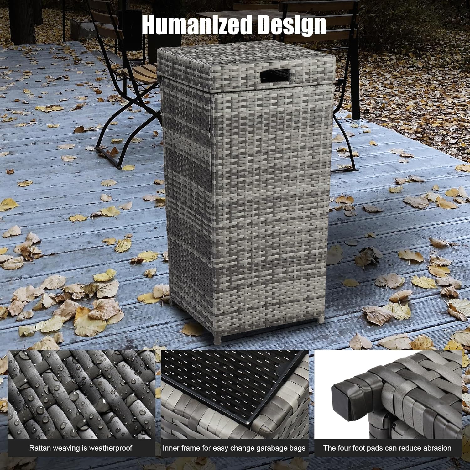 - Durable & Sturdy: Our patio trash can is crafted from UV-resistant PE rattan and a steel frame, ensuring it remains sturdy, stable, and long-lasting