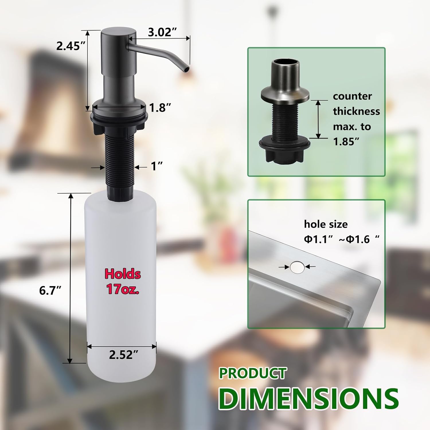 - 【Easy Installation】You can easily install this built-in soap dispenser on many kinds of kitchen sink or countertop with hole size between 1.1"-1.6", no require plumber. A detailed step-by-step installation instructions is included.