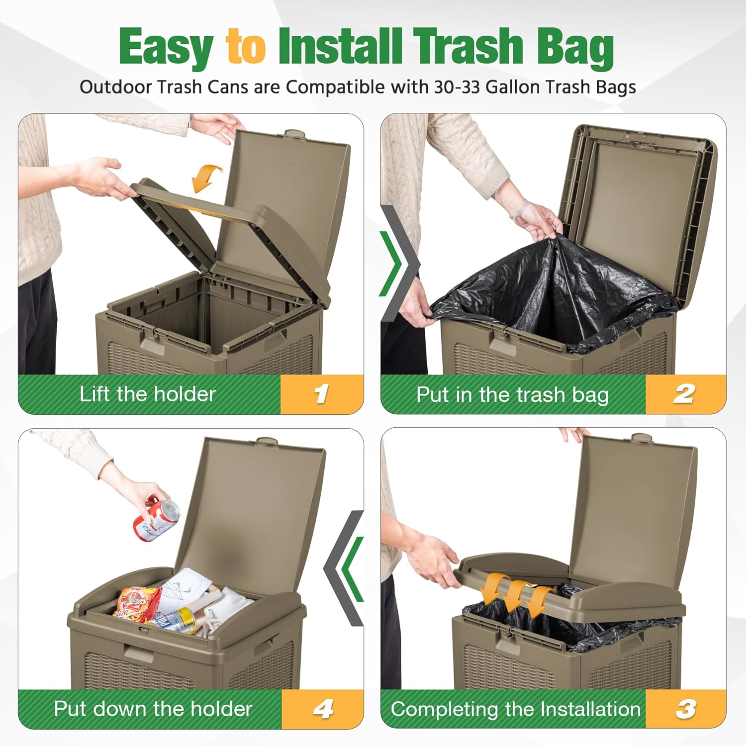 - Easy to Install Trash Bags: The waste bin for outdoors is compatible with 30-33 gallon trash bags. You need to lift the trash bag holder, put on the trash bag, put down the holder, and then finish the installation. After opening the inner lid, the garbage bag can be stably fixed in the card slot.