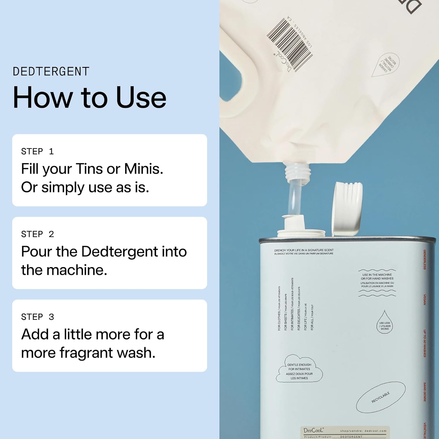 - NON-TOXIC & VEGAN: Clean, eco-conscious detergent crafted without harsh chemicals, dyes, or animal testing—safe for skin, kind to the planet, and designed to match DedCool’s modern, sustainable values.