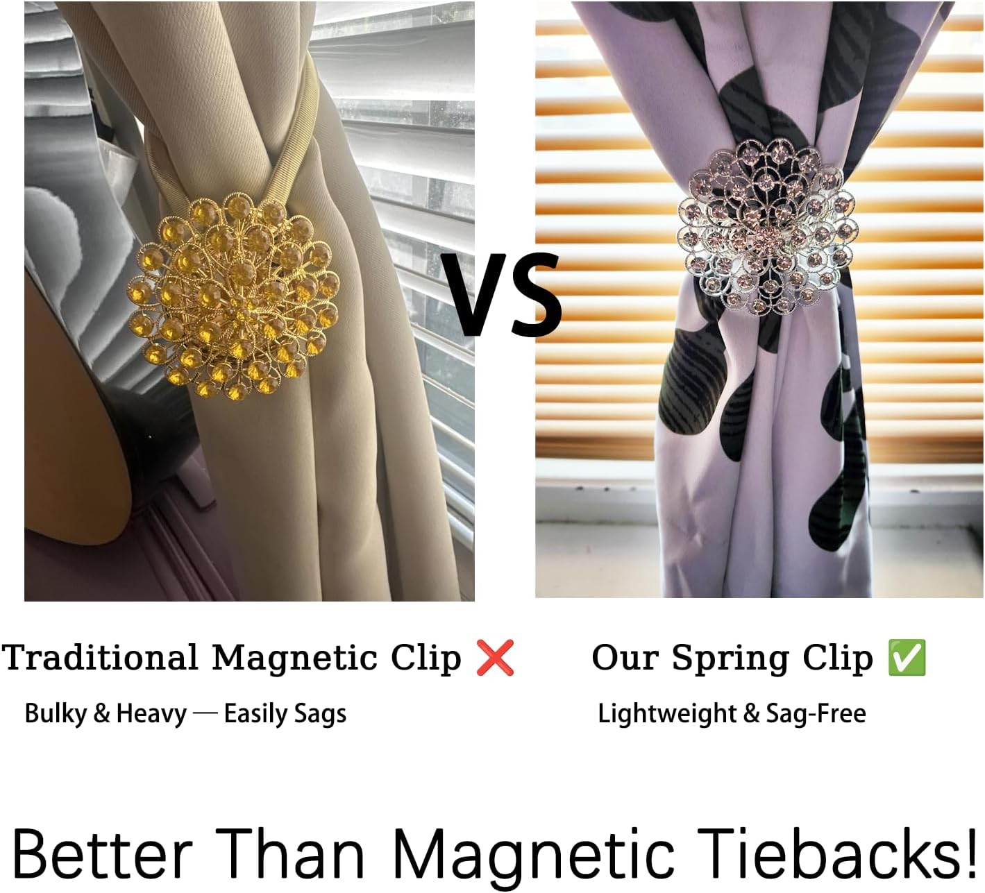 - 【Elegant Crystal Curtain Tiebacks】 These elegant crystal flower curtain tiebacks feature silver flower-shaped designs adorned with sparkling rhinestones. The crystal finish adds a luxurious and stylish accent to any room.