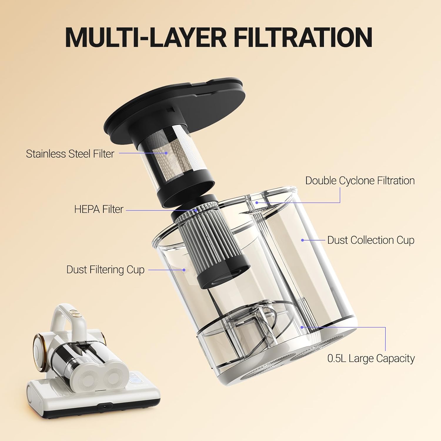 - 【Multi-Layer Filtration】The handheld vacuum cleaner is designed with a layered filtration system and dual dust cup structure, providing enhanced filtration performance. The advanced HEPA filter captures 99.97% of fine particles as small as 0.3 microns, effectively separating impurities, skin flakes, and dust to prevent filter clogging. This prolongs the filter’s lifespan and ensures consistently powerful suction.