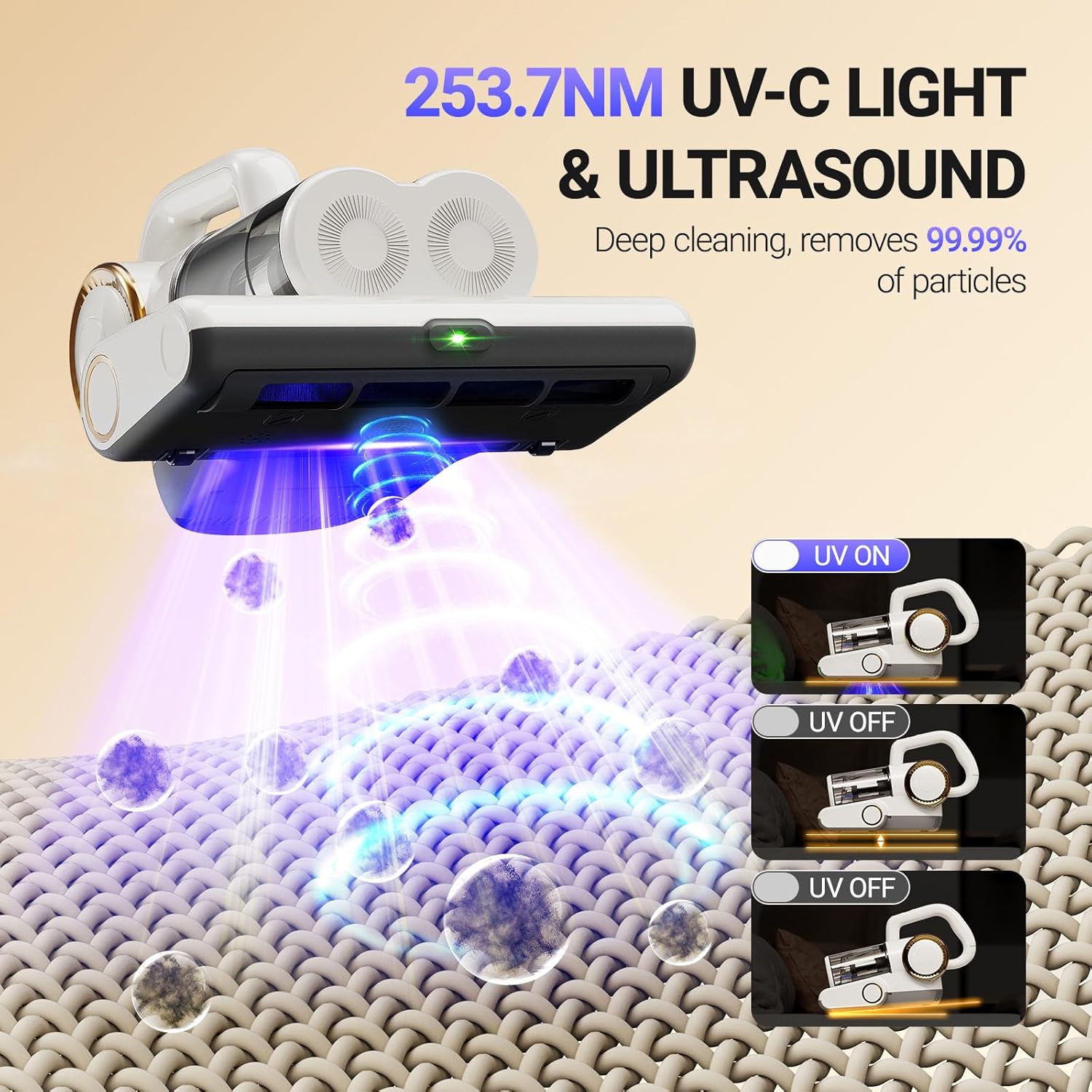 - 【Advanced UV-C Technology】Our versatile bed vacuum cleaner features a 253.7nm UV-C light and 40,000Hz ultrasonic waves, reaching deep into mattress layers to remove 99.9% of unseen substances. Equipped with gravity-sensing wheels at the base, the UV-C light automatically turns on when the machine contacts the surface, and turns off automatically when lifted or tilted to prevent UV leakage and ensure safe use.