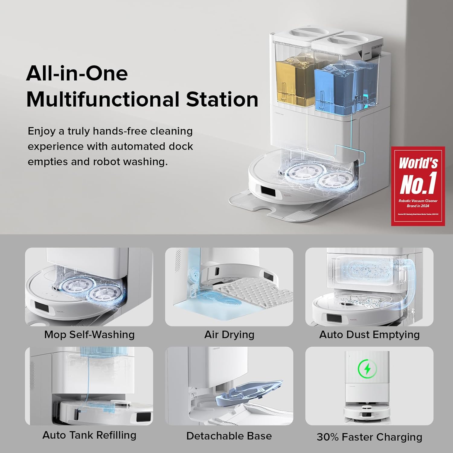 - All-in-One Docking Station: Designed for ultimate convenience, the advanced docking station automatically empties dust into a sealed 2.7L bag with 7-week duration, refills the water with a 4L tank for 3552 sqft coverage, thoroughly washes mopping pads and dries them, ensuring the robot vacuum and mop always ready for the next cleaning.