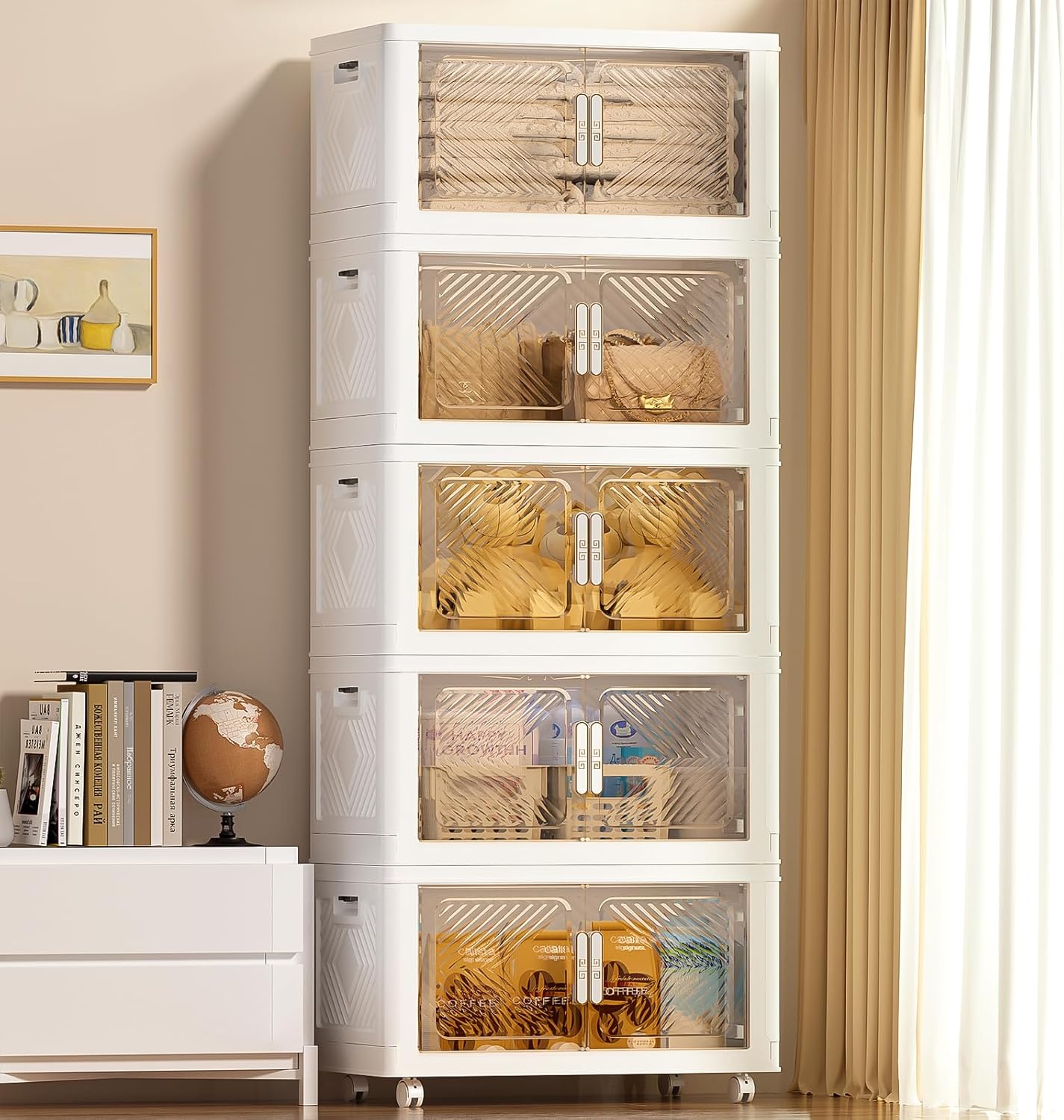 - 【Double Door & Visual Design】The storage boxes can be opened from the front doors and the top lid, 2 opening ways are convenient for retrieving items from different directions. The top lid makes it easy to quickly access large items, such as clothes and blankets. Powerful magnets are built into the front door to ensure that it will not automatically open. The door is made of transparent material, making the clear storage bins visible, so you can quickly find the items you need and save your time