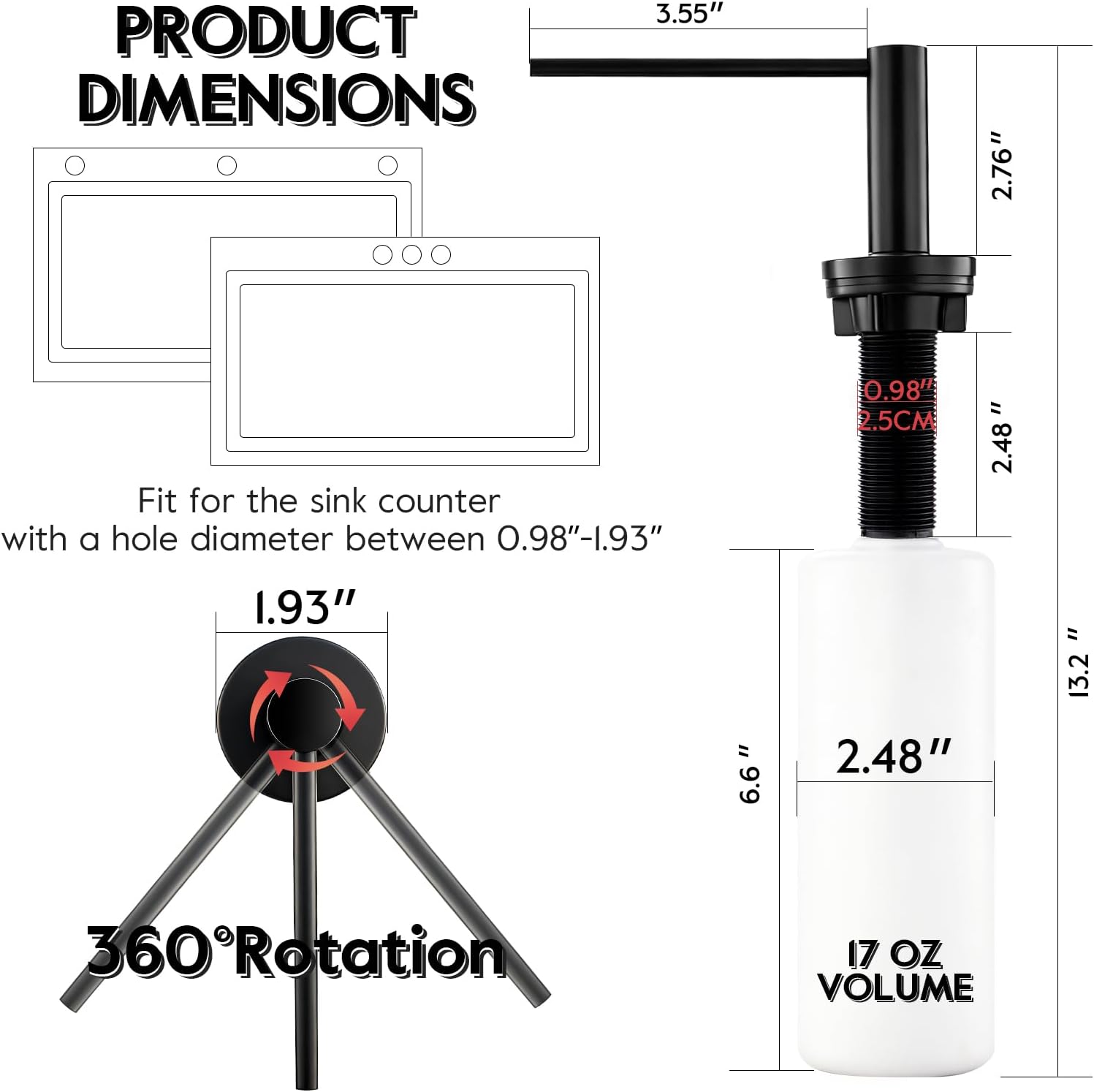 - [Multifunctional Use] This multifunctional sink soap dispenser is engineered for seamless integration in both kitchen and bathroom environments. Equally effective for dispensing dish soap near kitchen sinks and hand soap at bathroom vanities, its universal design accommodates various liquids including hand sanitizer, lotion, and baby shampoo. The corrosion resistant construction ensures long term reliability in high humidity spaces