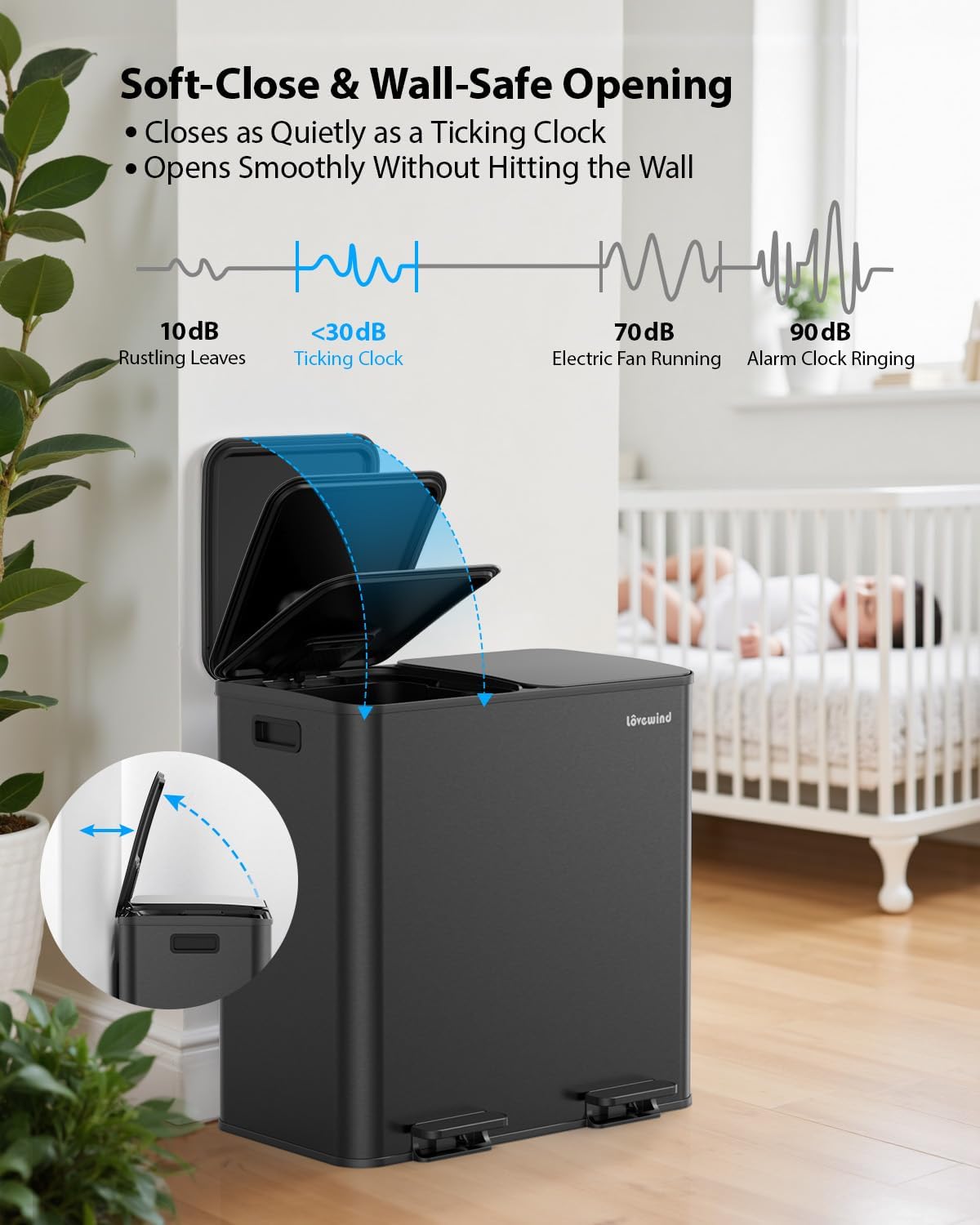 - Whisper-quiet Closing: The recycle bins for kitchen feature a soft-close mechanism that allows the lid to close gently, slowly, and silently
