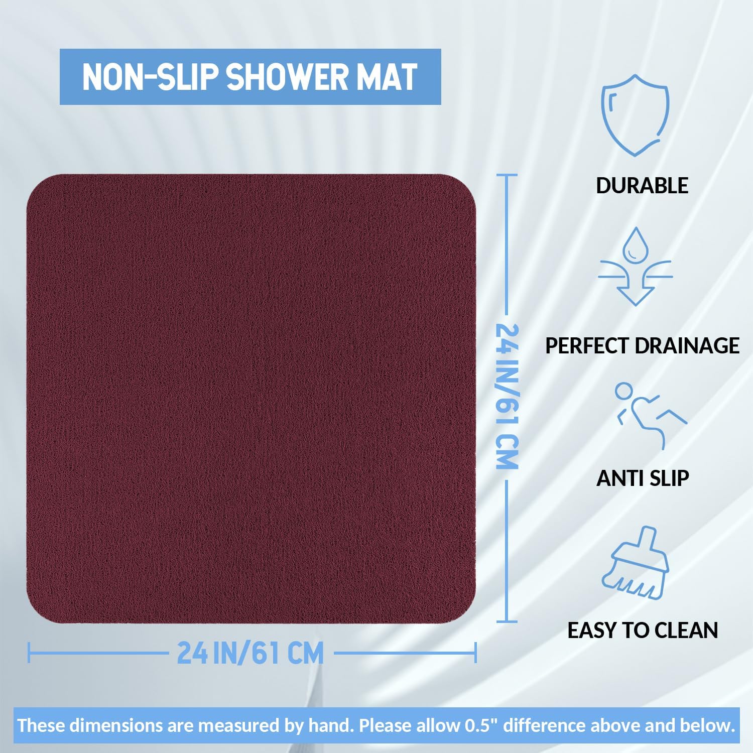 Non-Slip Bathtub Mat, Anti Slip Shower Mat, Fast Drying Bathtub Mats, Foot Scrubber Mat, Anti Slip Mat for Tub, Floor, Bathroom, Kitchen, Home, Hotel (Wine Red 24"×24")