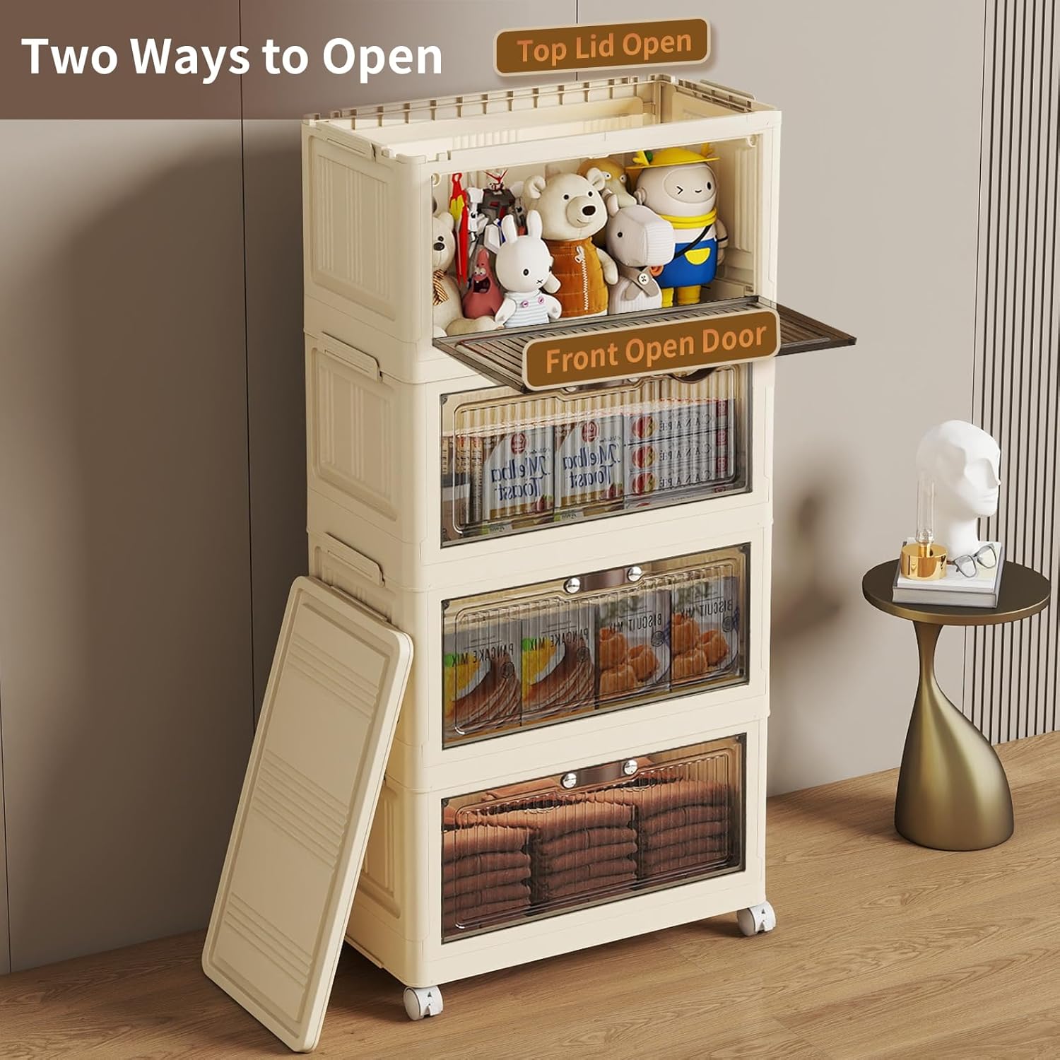 4 Tier - 34QT Storage Bins with Lids, Collapsible Storage Bins with Doors and Wheels, Plastic Storage Cabinet for Easy Storage and Organization for Living Room, Office