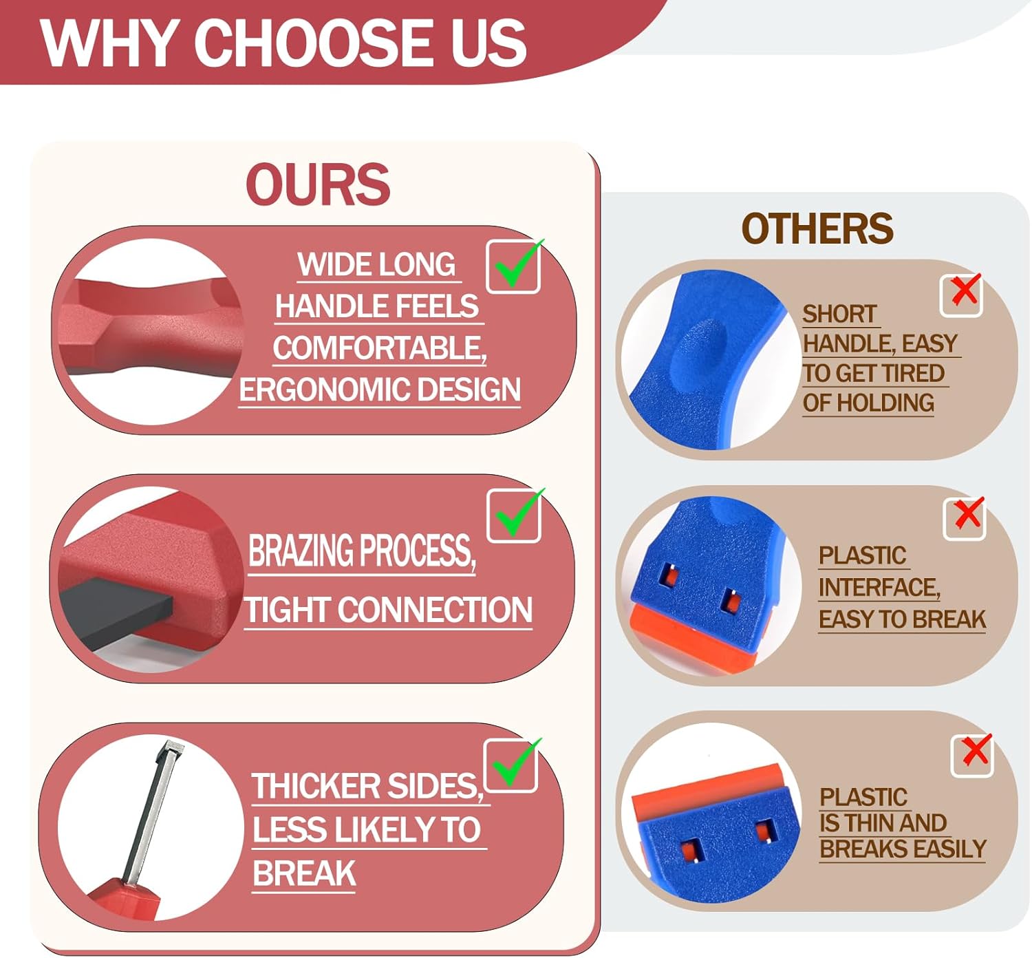 - 【Tungsten Steel Blades】Crafted from high-quality tungsten steel, the scraper heads offer excellent hardness and durability. The copper welding process ensures a firm, stable connection, preventing the blades from loosening .