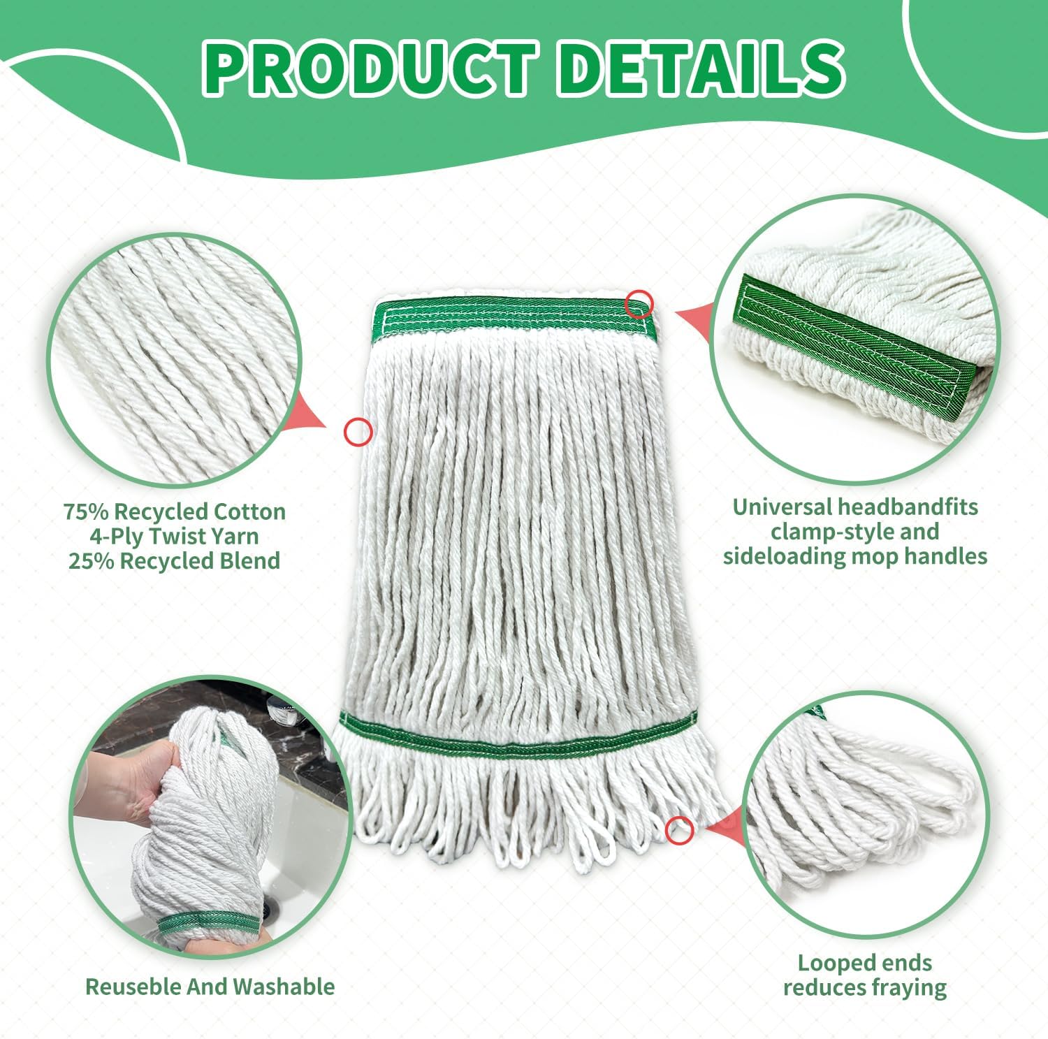 - High Quality Material: Made from 75% post-industrial recycled cotton and 25% recycled blend, High-density cotton rapidly absorbs liquids, and the thread head helps you to wring it out quickly; It withstands frequent use and heavy pressure, and effectively clean and dry the ground.