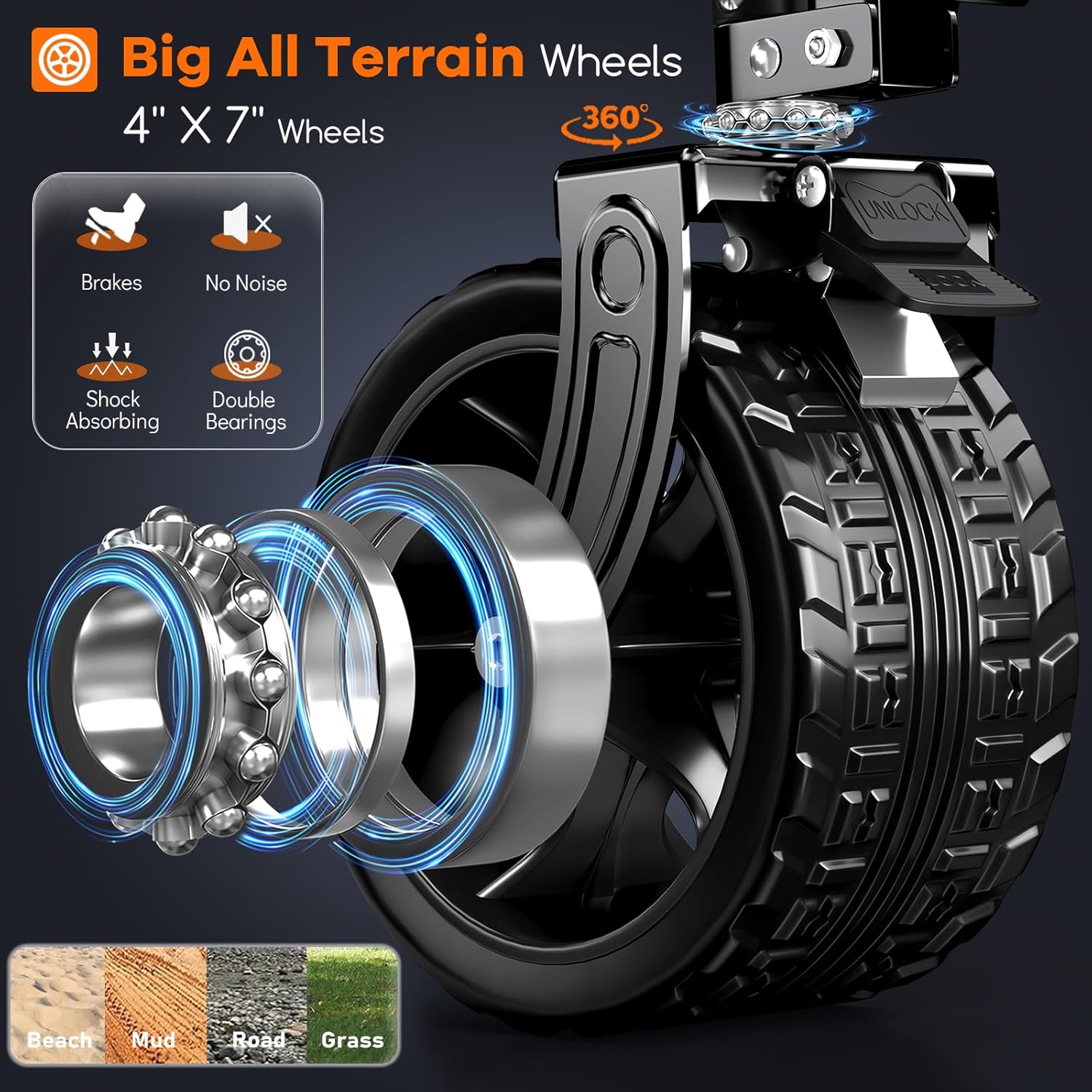 - 【𝟯𝟲𝟬°𝗥𝗼𝘁𝗮𝘁𝗶𝗼𝗻 𝗨𝗻𝗶𝘃𝗲𝗿𝘀𝗮𝗹 𝗔𝗹𝗹-𝘁𝗲𝗿𝗿𝗮𝗶𝗻 𝗕𝗶𝗴 𝗪𝗵𝗲𝗲𝗹𝘀 𝘄𝗶𝘁𝗵 𝗕𝗿𝗮𝗸𝗲𝘀, 𝗦𝘂𝗶𝘁𝗮𝗯𝗹𝗲 𝗳𝗼𝗿 𝗩𝗮𝗿𝗶𝗼𝘂𝘀 𝗥𝗼𝗮𝗱 𝗦𝘂𝗿𝗳𝗮𝗰𝗲𝘀】This beach carts features 4 larger and wider 7"x4" double bearings all-terrain big wheels, allowing for flexible steering and smooth rolling on various road surfaces such as mud, grass, and hard sand. The two 360° rotation front wheels with brakes, effectively to stop and prevent the wagon from moving. It' s shock-absorption and noise-reduction, ensuring durability and resistance to wear and tear.